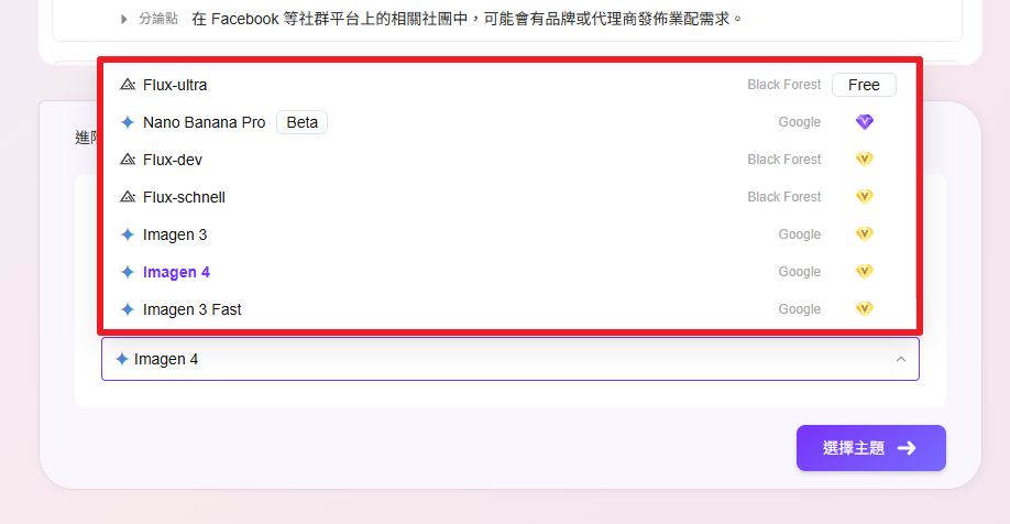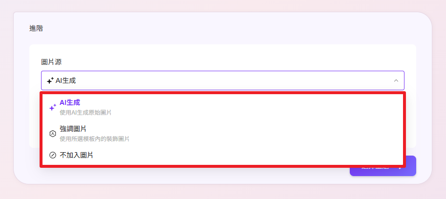 這邊補充一下~簡報內的圖片來源可由 AI 生成、直接套用模板內現有的圖片,或是不使用圖片。圖片部分支援 Black Forest 與 Google 模型。