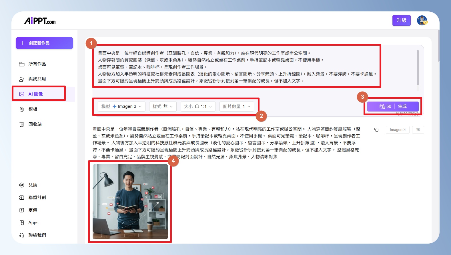 在會員功能頁點選左側的「AI 圖像」,先輸入提示詞,並設定生圖模型、樣式與比例,完成後按下「生成」按鈕。