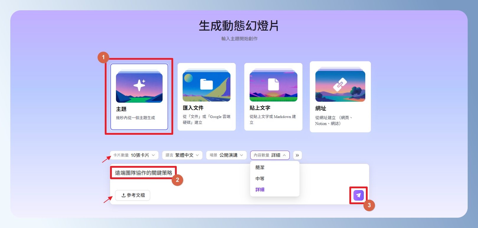 選擇簡報資料來源,支援主題、文件、文字與網址等格式。接著設定簡報頁數、語言、使用場景與內容詳細度。完成後輸入相關說明,或上傳參考文件,點擊右下角按鈕即可開始生成。以下將以「遠端團隊協作的關鍵策略」主題為例,實際操作給你看。