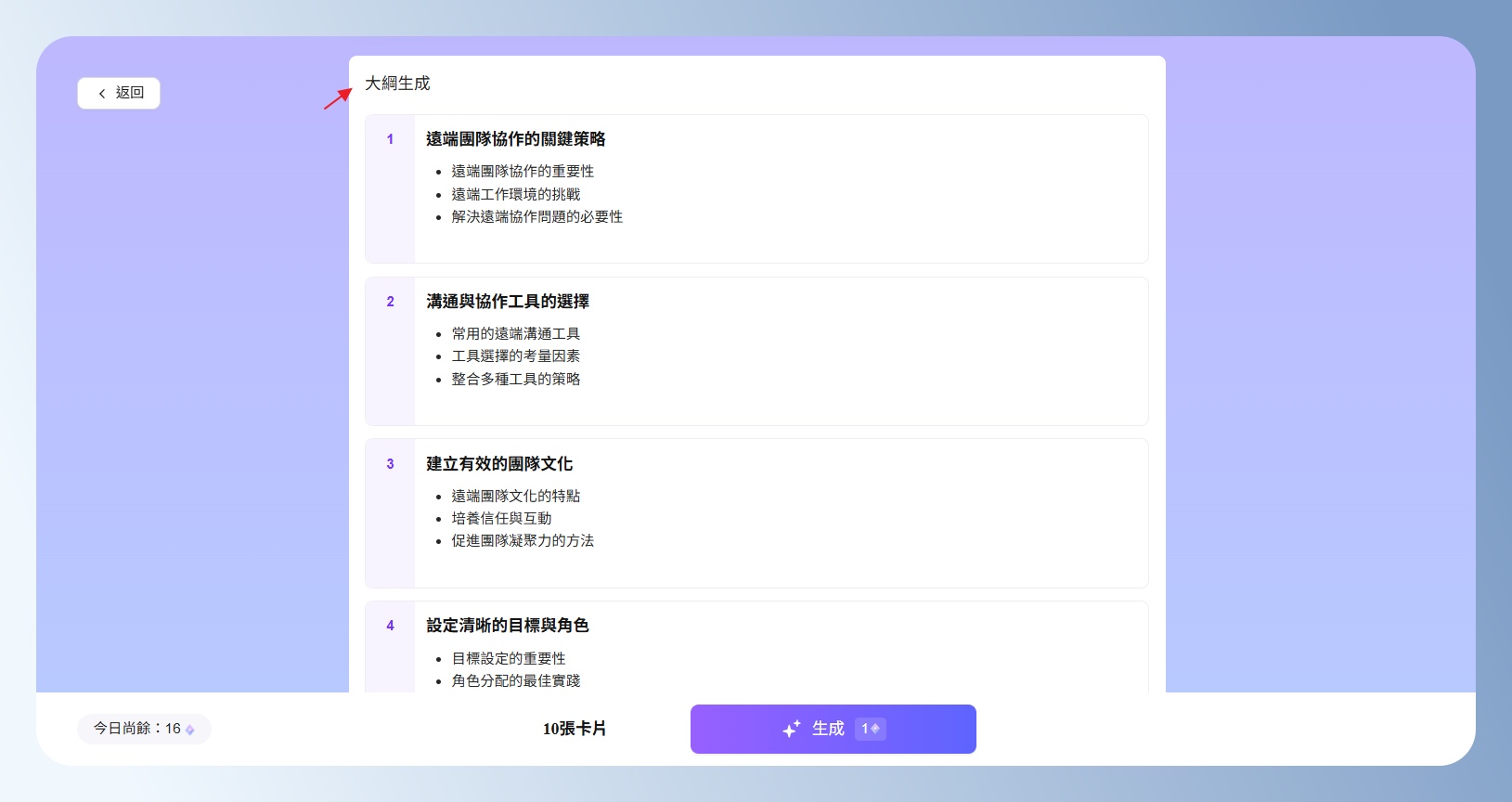 查看 AI 自動彙整的大綱內容,如果有想要調整的地方,可以直接框選文字進行修改。