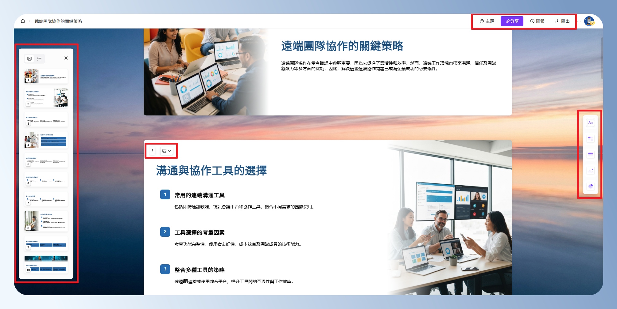 查看生成結果。畫面左右兩側與右上角都有功能選單,每一張投影片的左上角也可以調整進階設定。