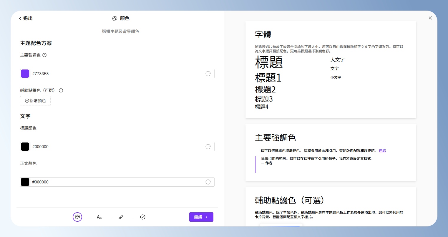 自訂簡報主題,可設定配色、文字樣式與排版方式。