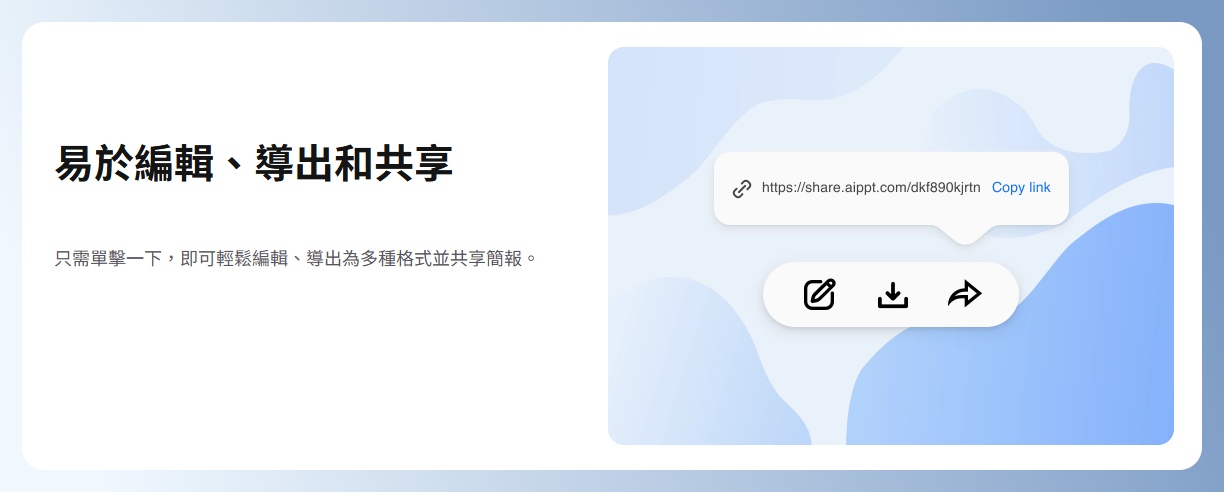 支援線上編輯,確認內容正確無誤後,可匯出 PPT 檔進行細部調整,也可以將簡報下載成 PNG、JPEG 圖檔,或產生連結分享給同事,操作方式直覺簡單。