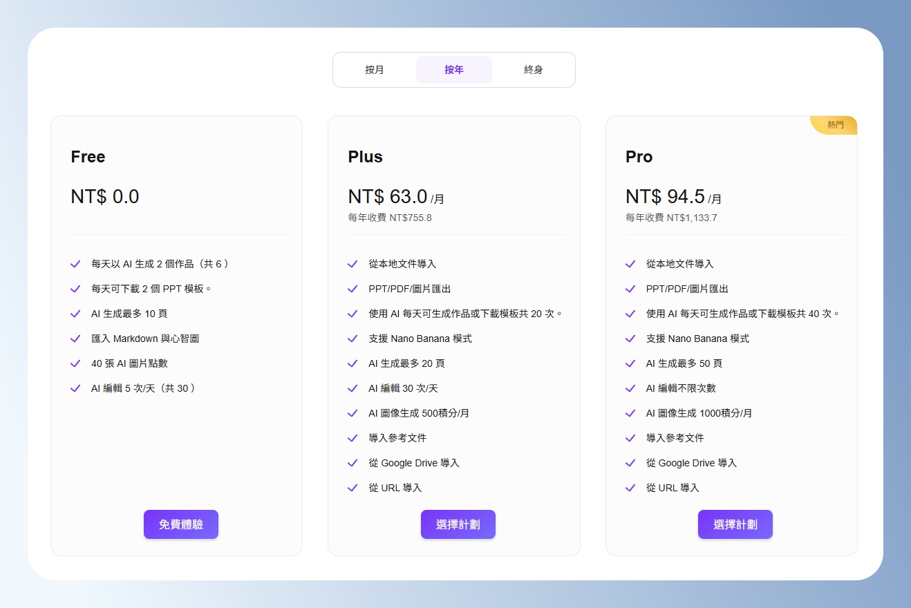 如果想完整測試簡報內容生成、模板選擇與匯出功能,建議先採用月繳方案,實際操作後,再評估是否符合自己的簡報製作需求。