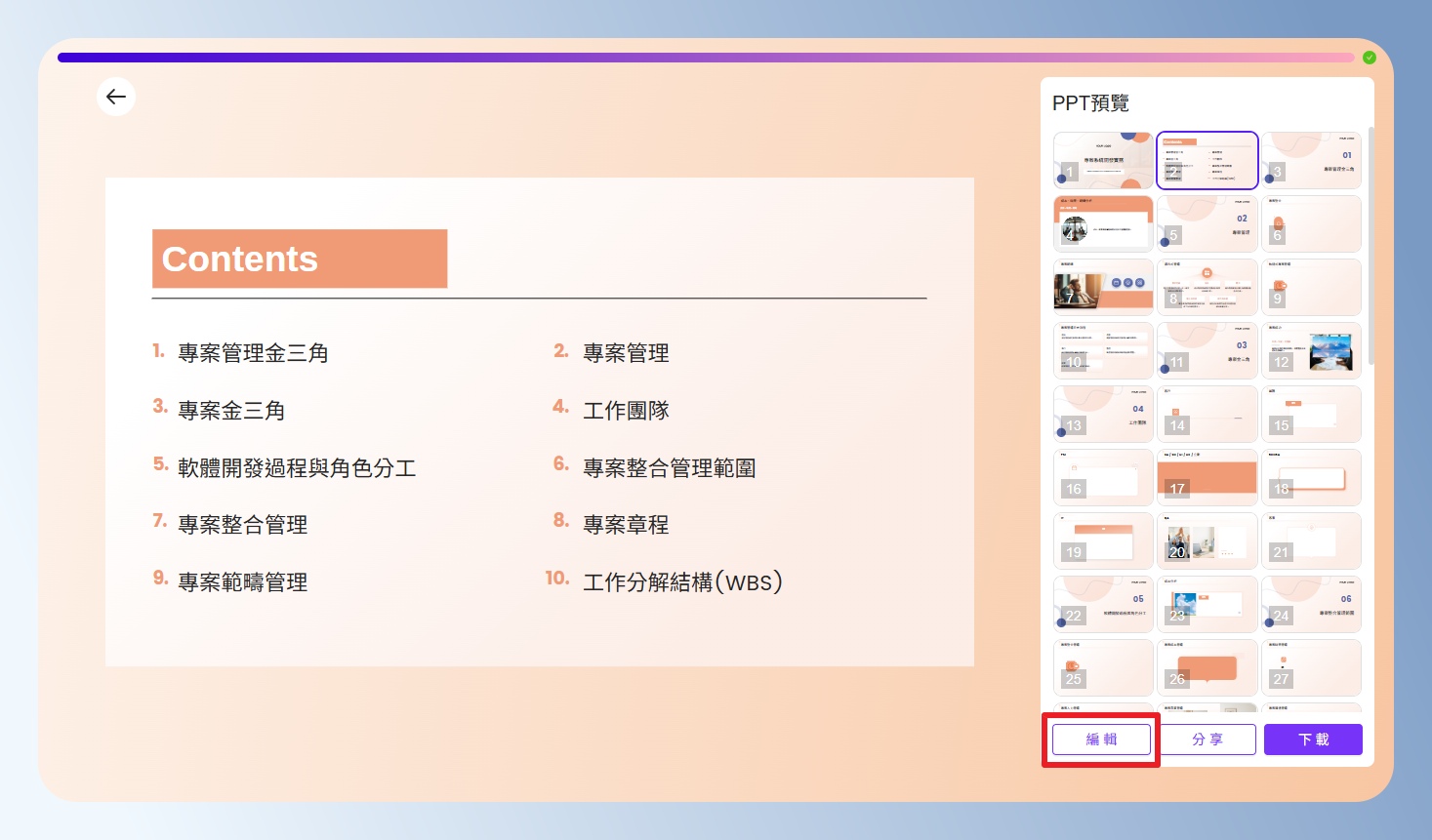 查看簡報生成結果,可點選下方的「編輯」進入簡報編輯模式。