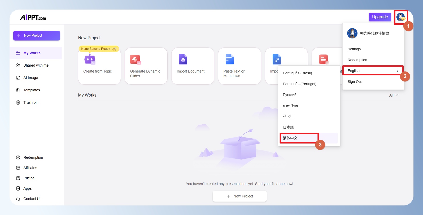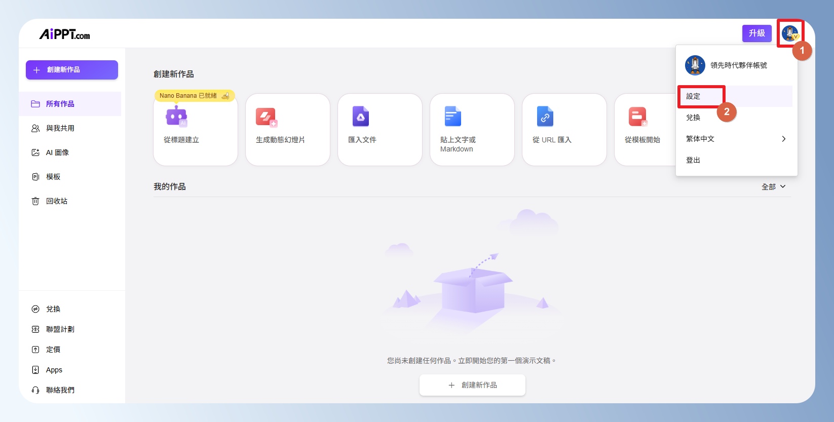 如果你的畫面是英文,可點選右上方的帳號頭貼,將「English」切換為「繁體中文」。