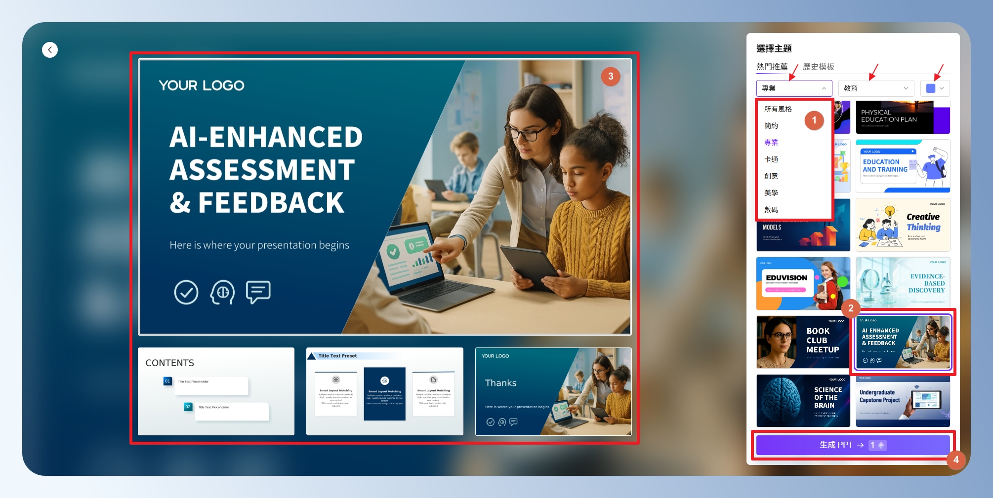 設定簡報主題,可透過上方的選單來選擇想要使用的樣式、場景與配色。點選模板後,按下「生成 PPT」就會開始生成簡報。
