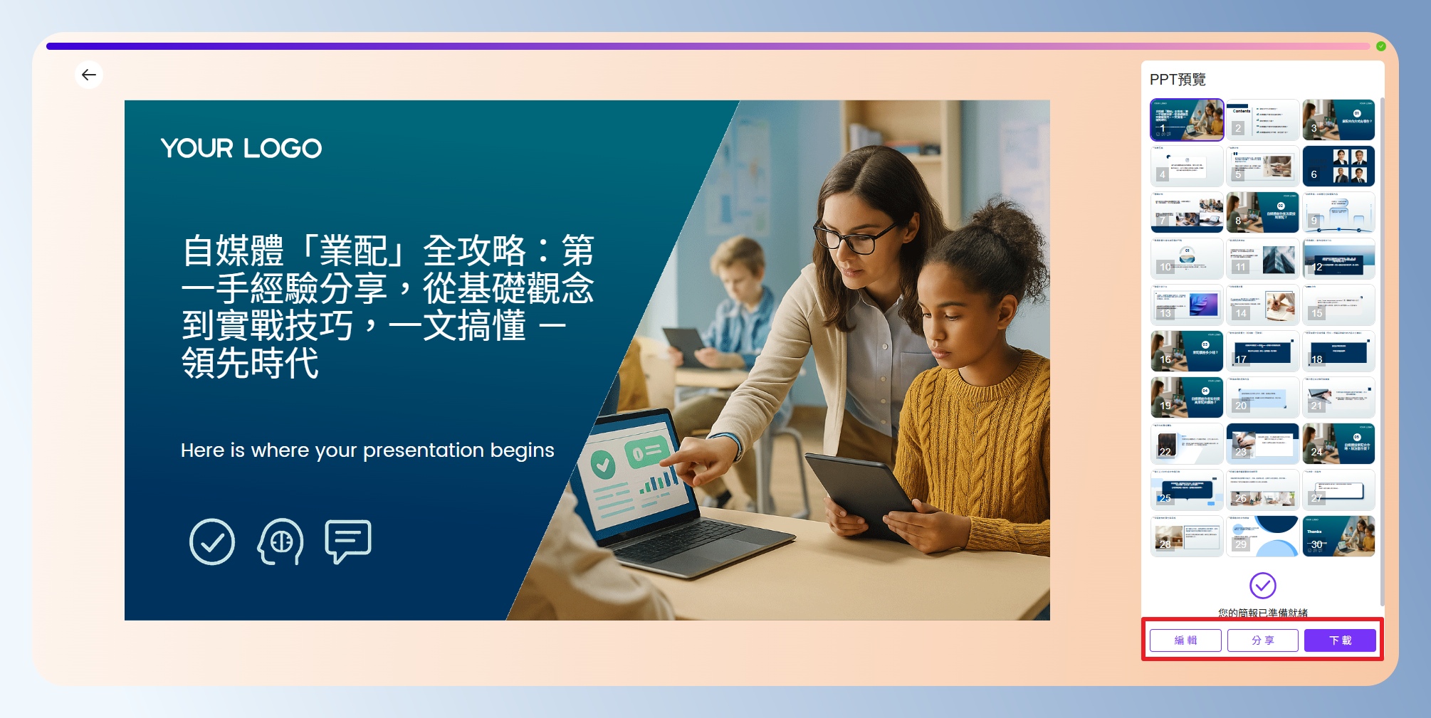 從大綱產出、內容編排到主題套用與檔案匯出,都能在同一個平台完成。對於需要頻繁製作提案、報告或教學簡報的人來說,能減少大量的排版與設計的時間,將重心放在準備報告逐字稿與簡報的口條練習上。