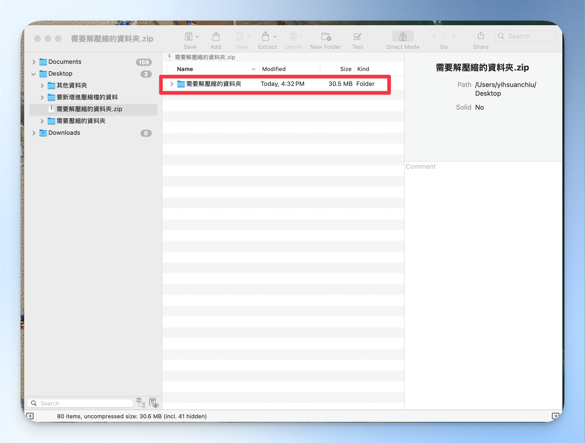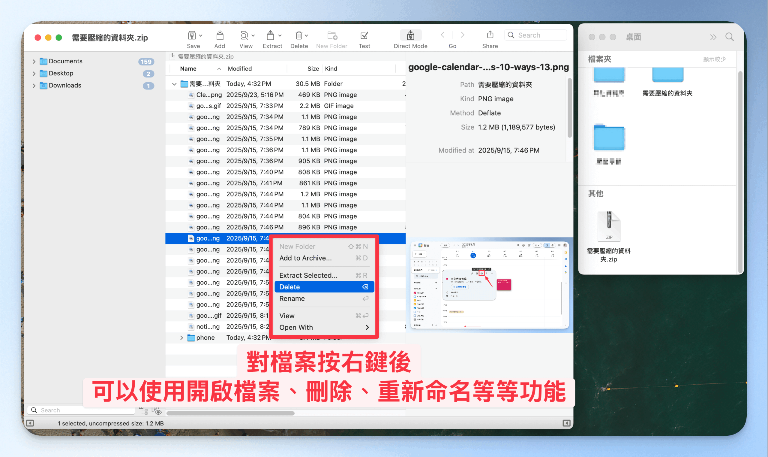 可以直接在 BetterZip 當中去進行資料的檢視、新增與刪除,不需要把那種超大的資料夾解壓縮再去處理,非常方便。