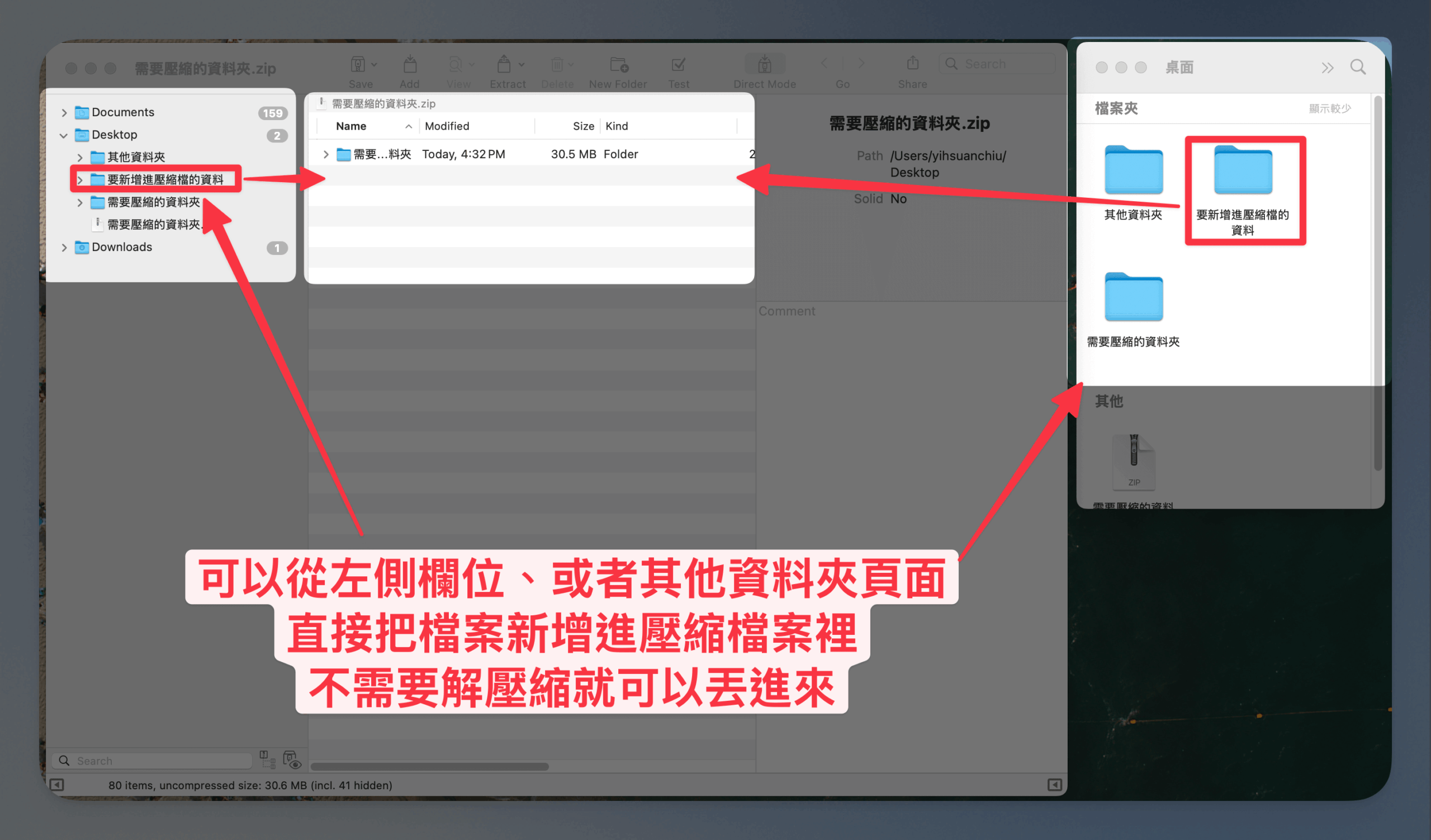 也可以從左側欄、或者其他資料夾視窗,直接在檔案仍舊是壓縮檔的狀況下,直接把資料新增進壓縮檔裡喔!step 5