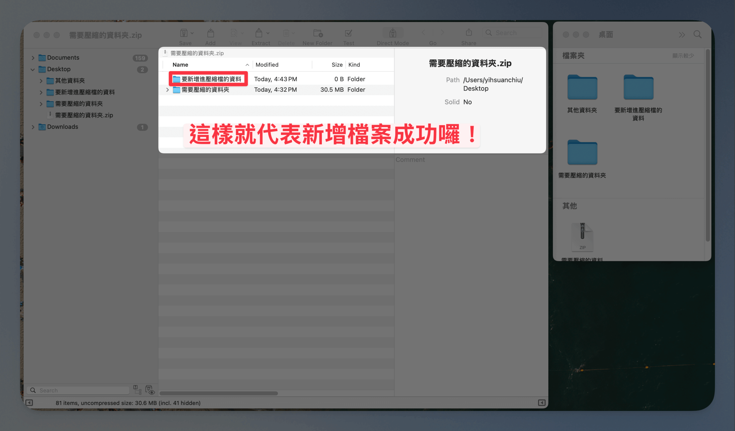 拖曳進去後,有出現新資料名稱,就代表新增檔案成功囉!如何用 BetterZip 幫壓縮檔案加密?