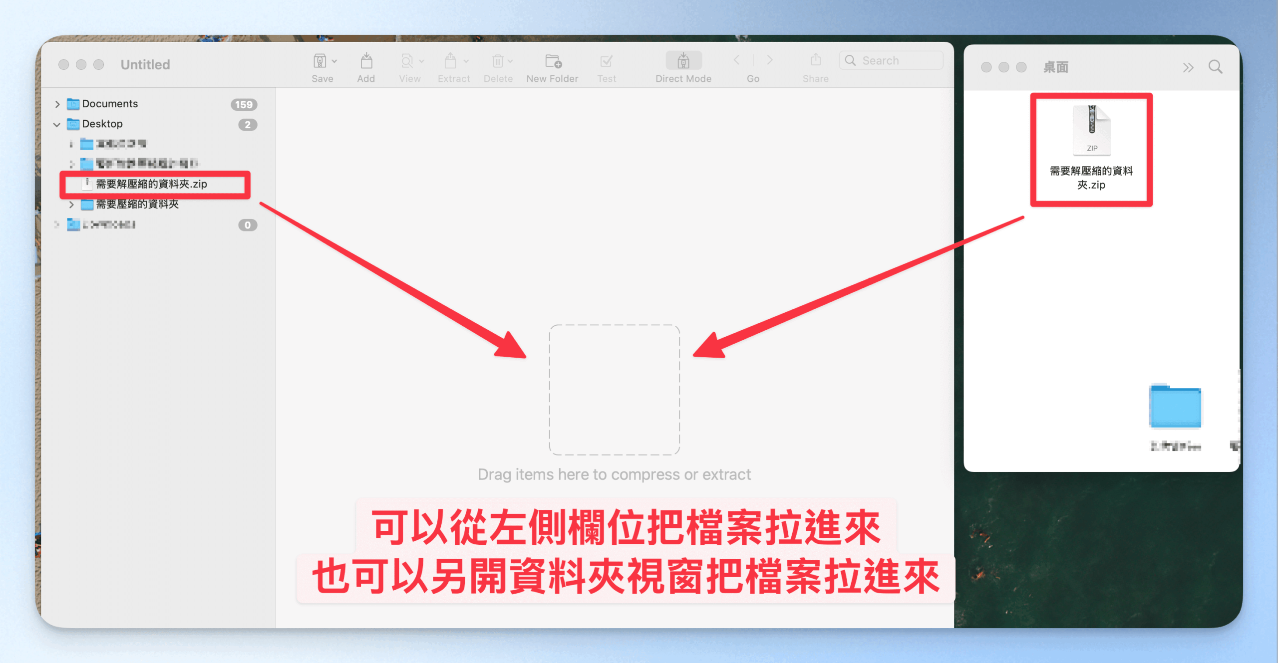 把檔案拖曳進 BetterZip 的虛線框框中step 2