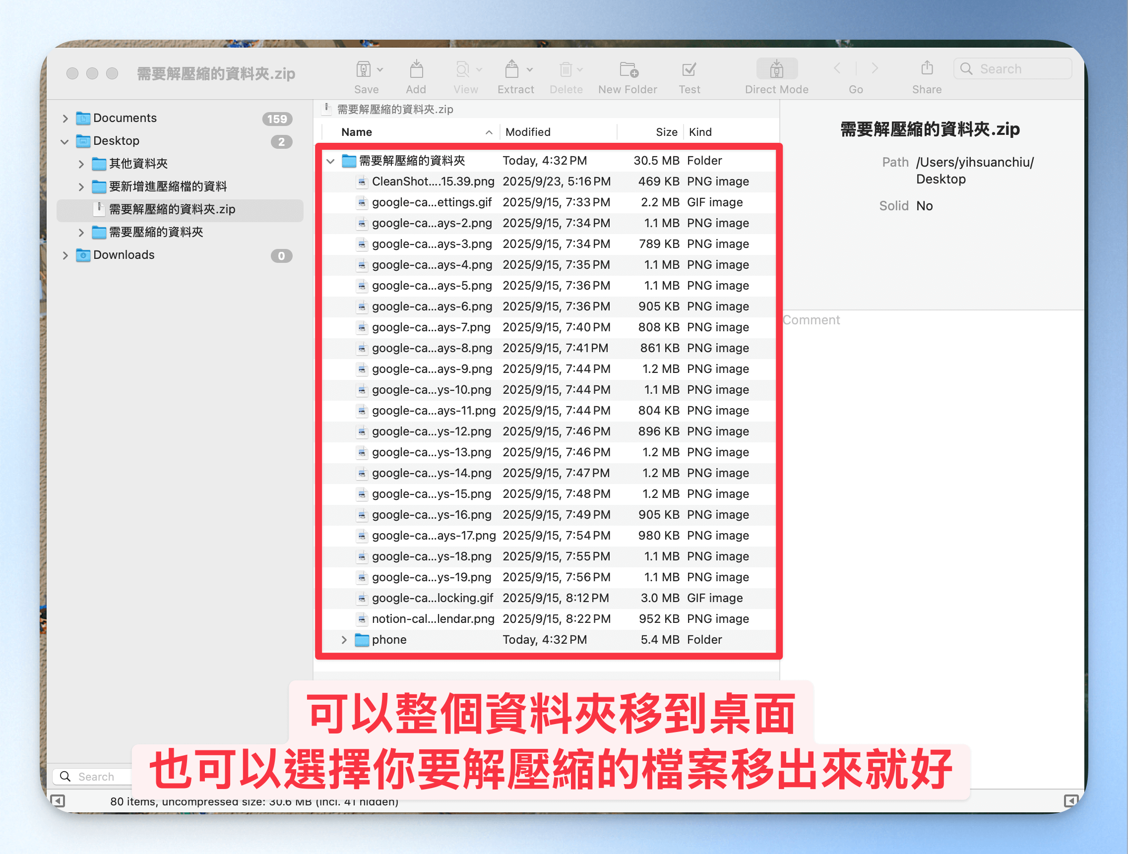 這邊可以只選擇你要解壓縮的特定資料,移出到外部檔案夾即可step 4