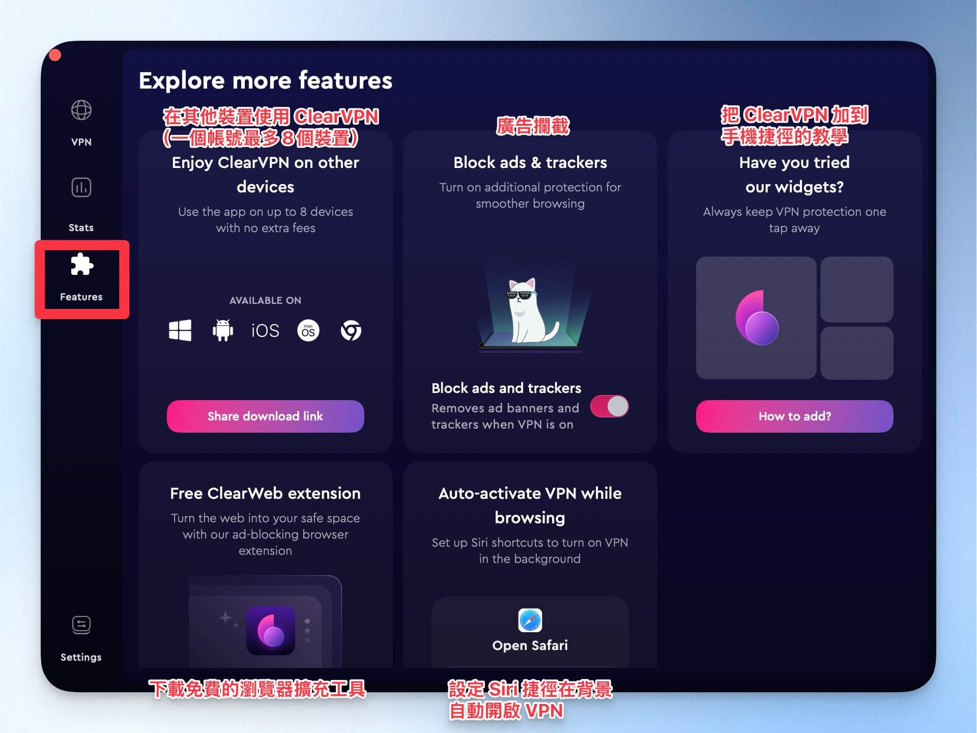 ClearVPN 的廣告攔截包含:防禦惡意廣告、阻擋侵入式彈出廣告、停用偽裝的第三方追蹤器等。