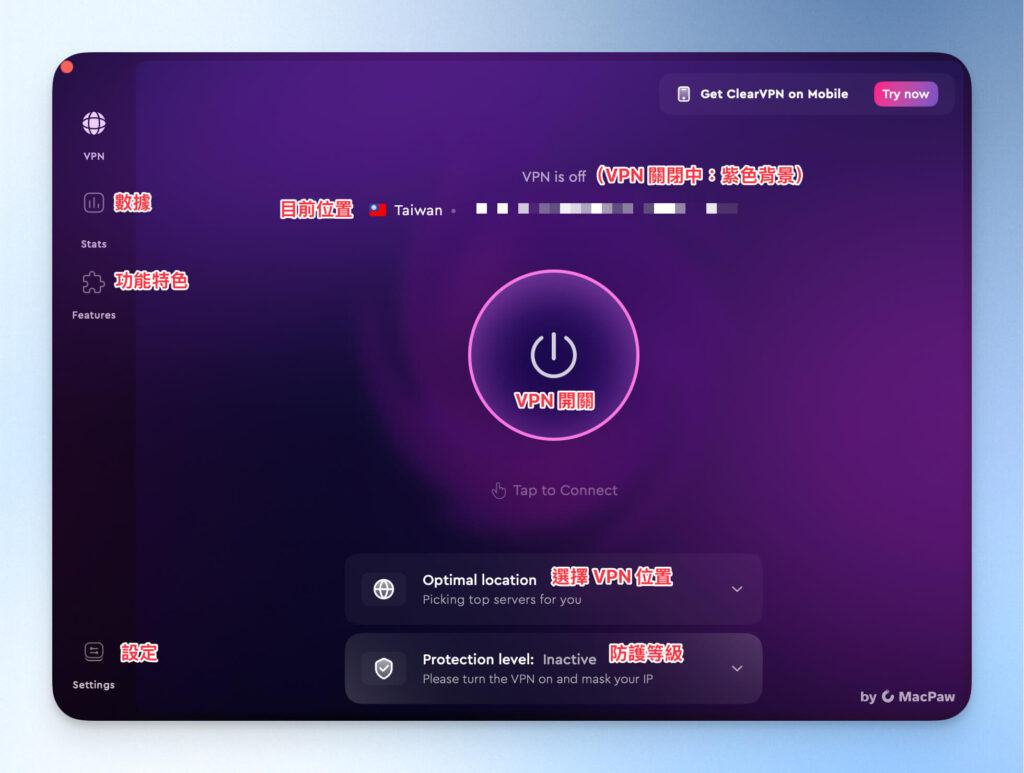 進到這個 ClearVPN 的介面就是安裝成功囉!點擊中央的 VPN 開關鍵就能開始使用