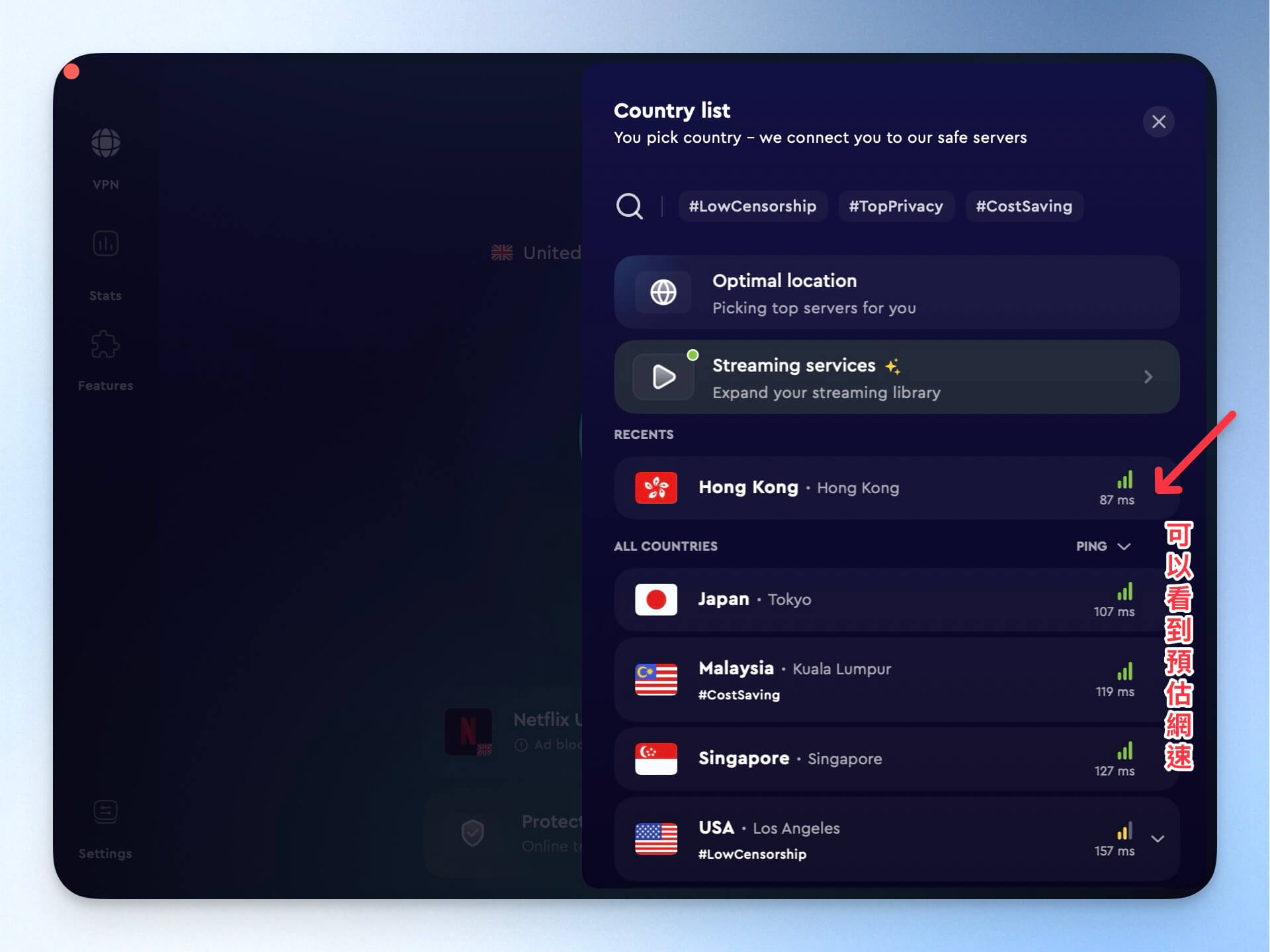 不過如果你想自訂國家,也是可以自行選擇的,還可以看到網速哦!