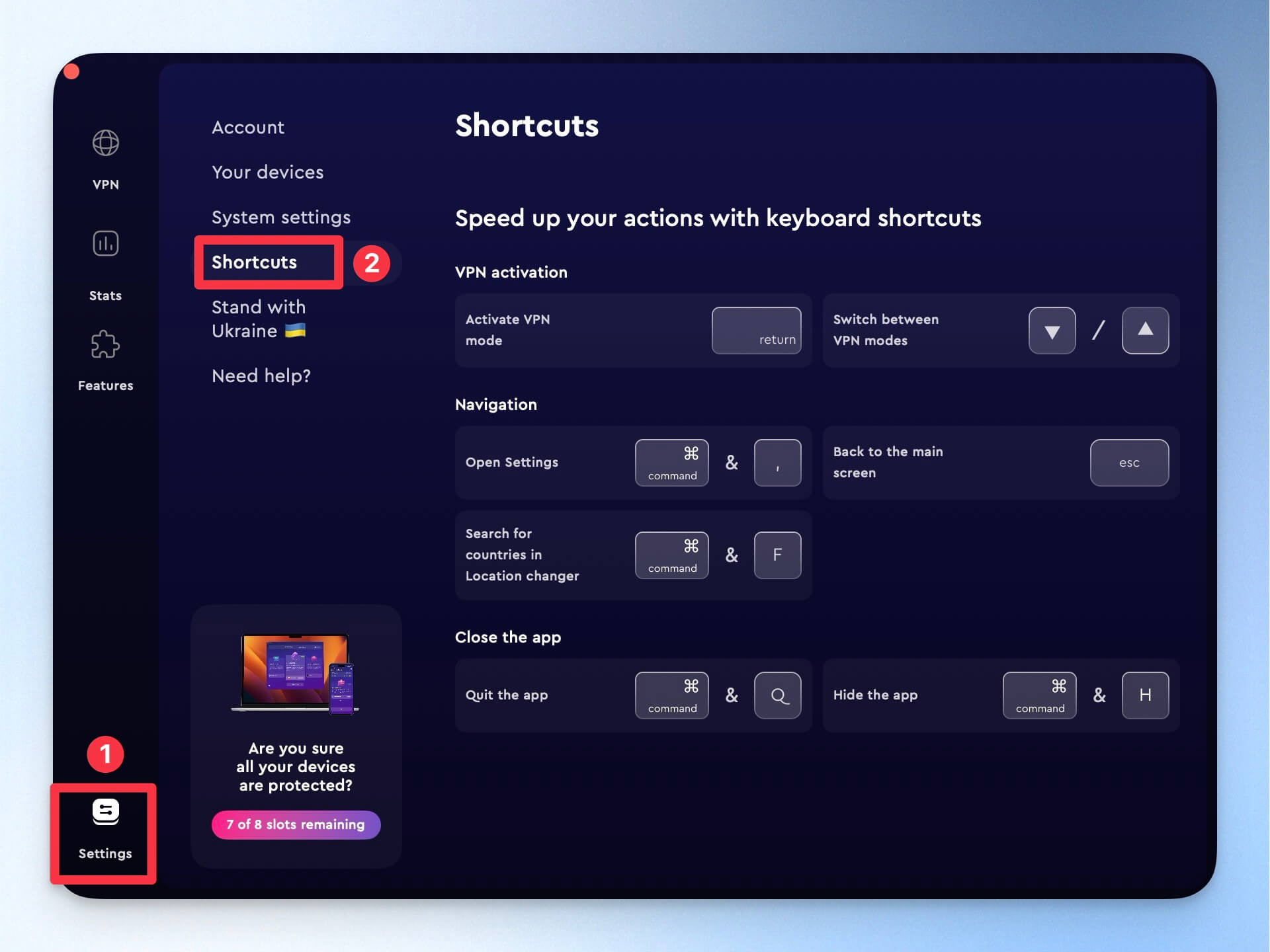 首先是裝置管理,點擊左下角的 Setting,選 Your devices 管理你的裝置。一個帳號可以連接 8 個裝置。