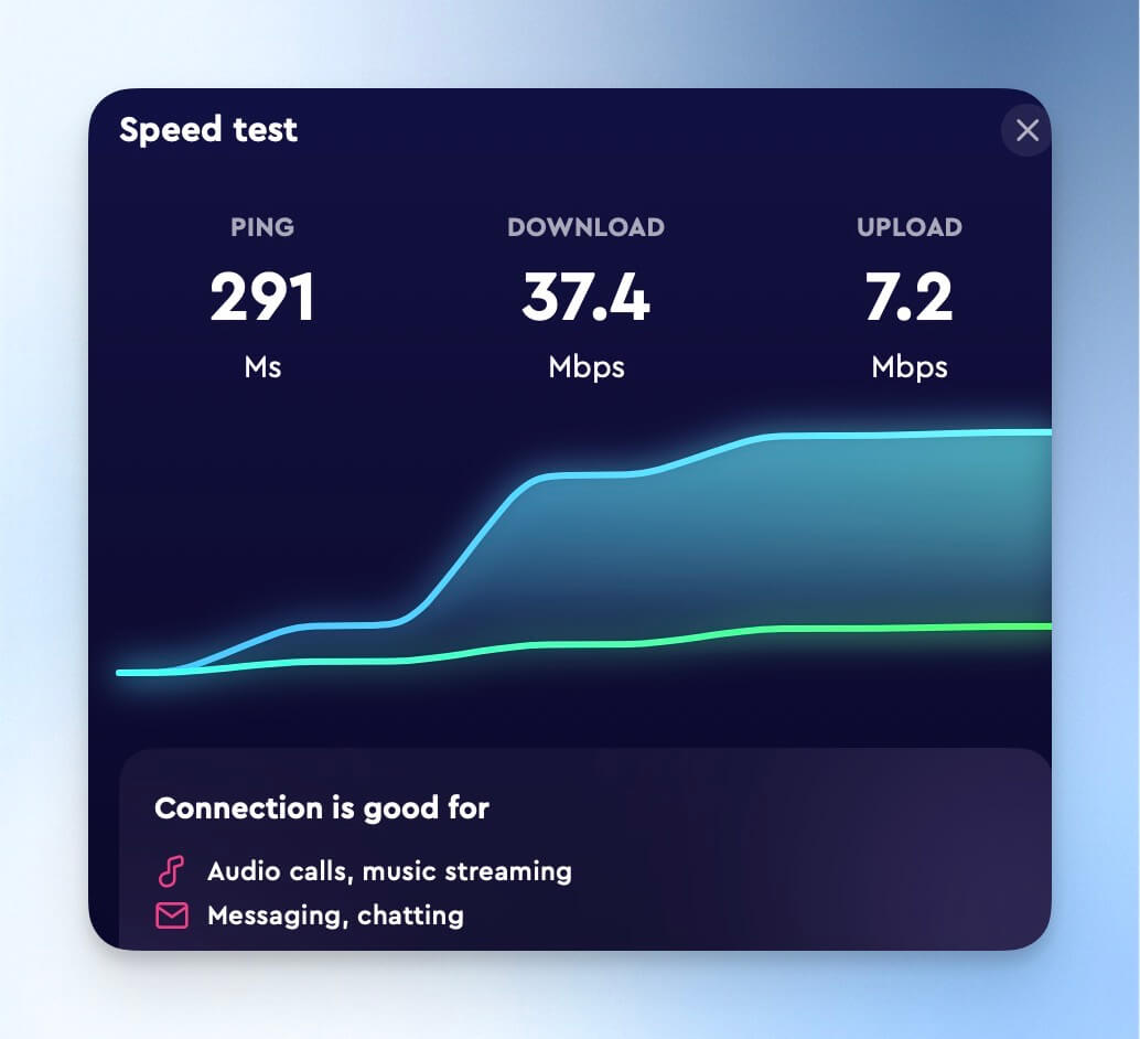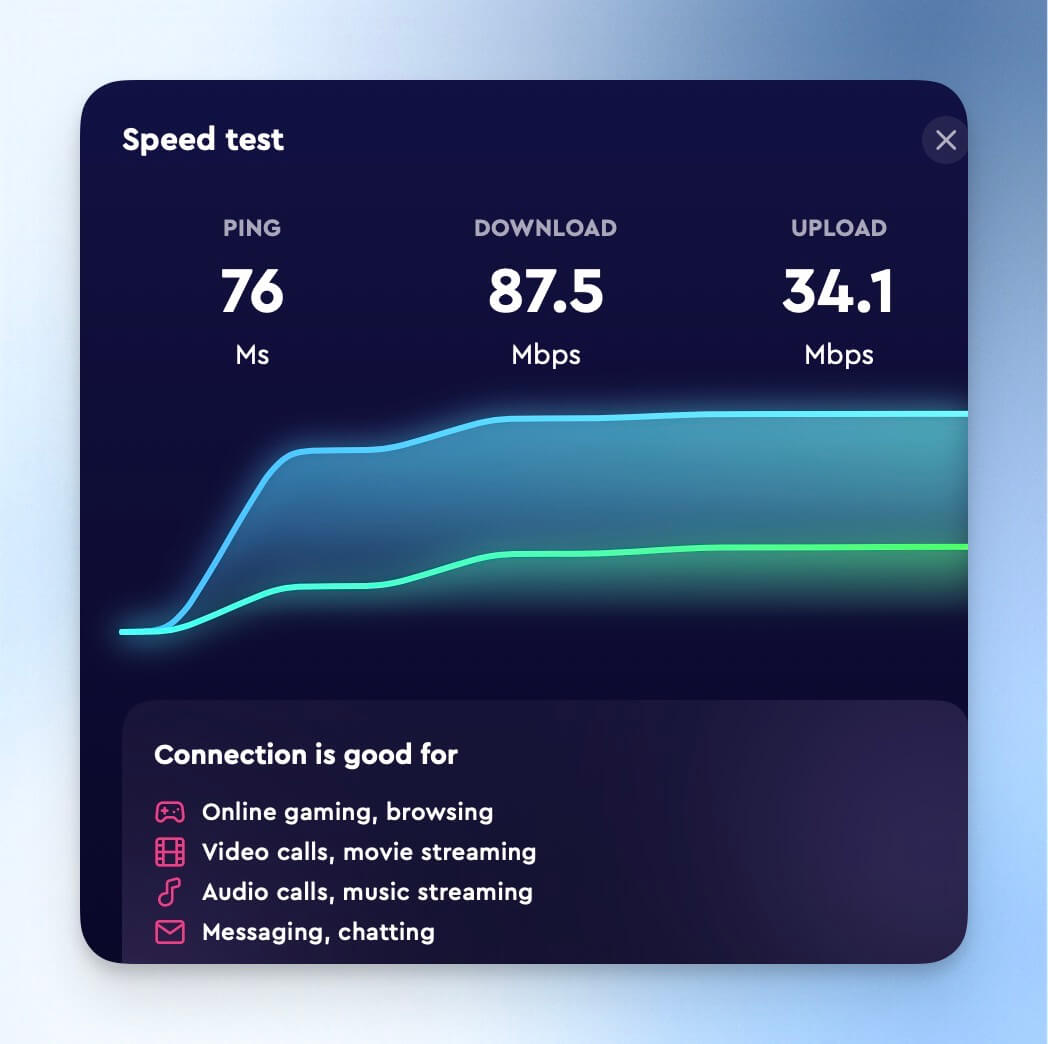 連接香港的伺服器,Ping 值為 61 ms,和未連接 VPN 時差不多,下載速度則降到 37.2 Mbps。我使用起來沒什麼慢速感,ClearVPN 也判斷這個速度是適合瀏覽網頁、玩網路遊戲、視訊通話、影音串流、訊息等功能的。