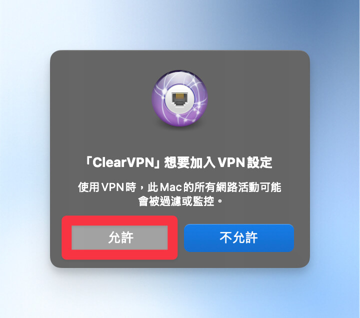 這時,電腦應該會請你開權限給 ClearVPN,點擊「允許」