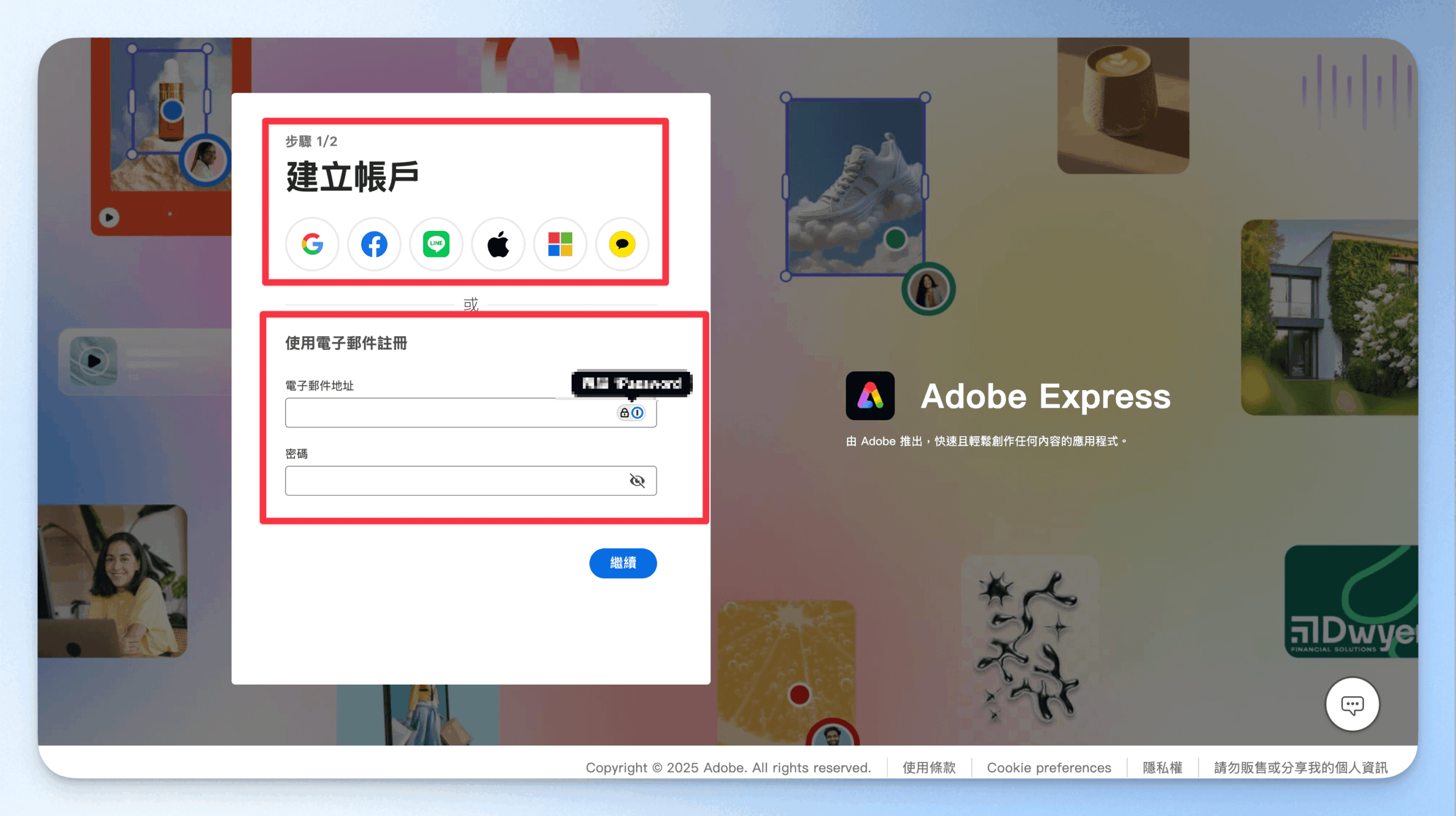 • 如果你平常有在使用 Adobe 系列軟體,已經有相關帳號,那推薦使用 Adobe Express ,直接讓你登入使用,不用重複註冊。