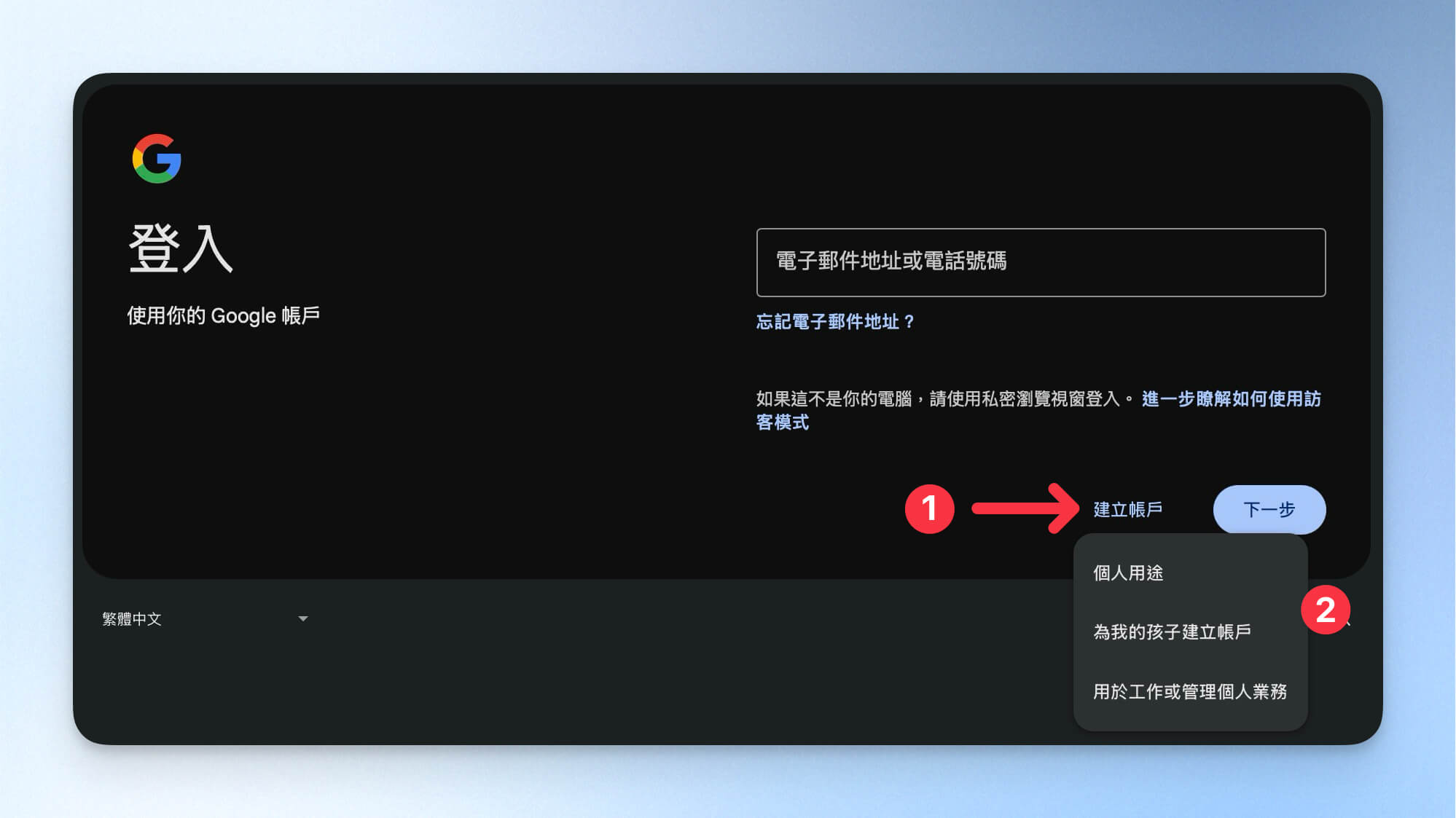 接著,不管是不是初次申請 Gmail 帳號,都會來到這個步驟。點擊「建立帳戶」後,選擇你的帳號用途。這裡我們先以個人用途來示範。這篇文章會介紹到個人免費版 Gmail 和企業版方案的不同,如果你還不確定用途,可以參考後面的這個章節。