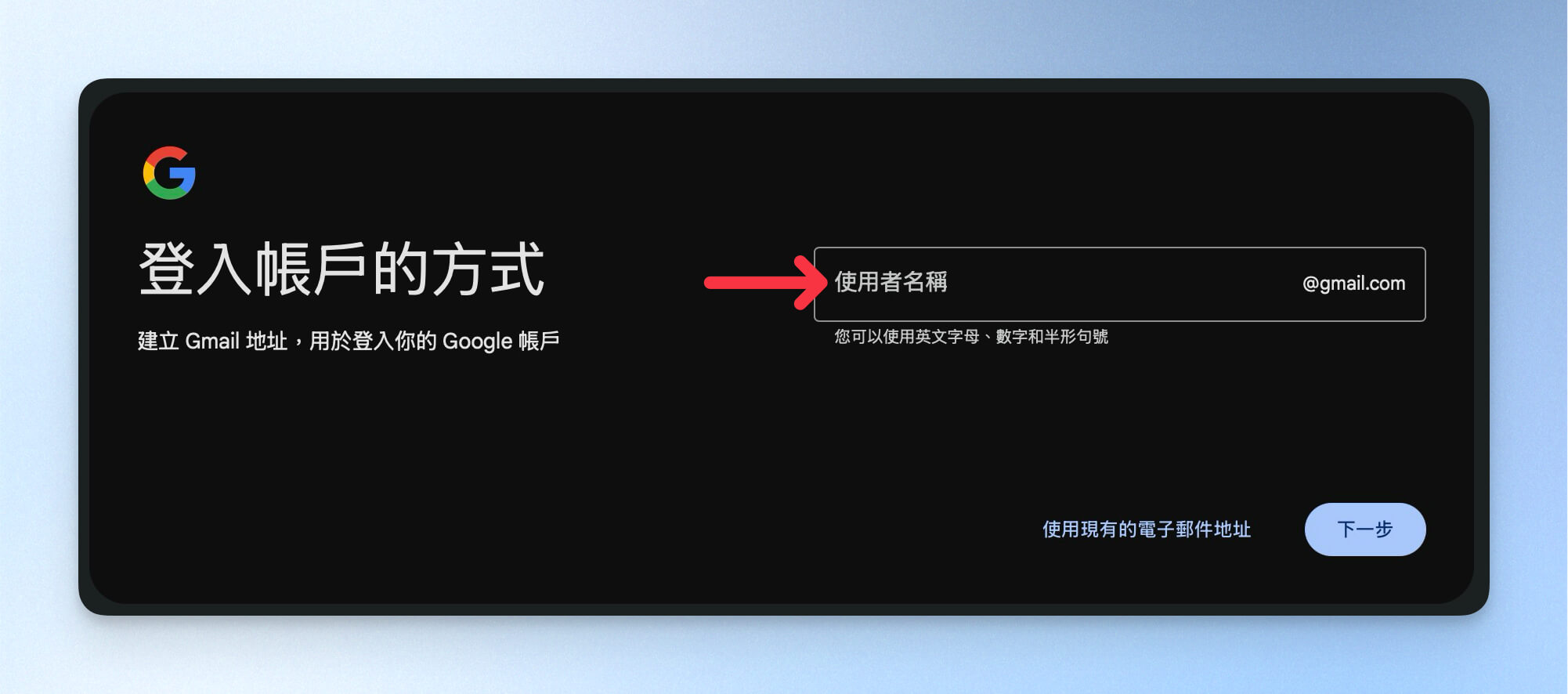 設定你的帳號名稱:____@gmail.com如果你想要的帳號名稱已經有人使用,Google 會推薦你一些替代方案,你也能自己想其他的名稱。輸入後點擊「下一步」