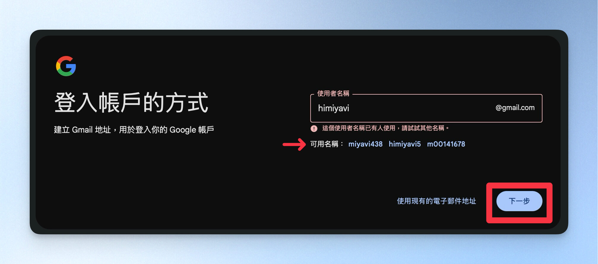 Google 會依照你想取的帳號給你幾個建議的選項,你也可以自行想其他的,直到試到一個獨一無二的帳號為止。