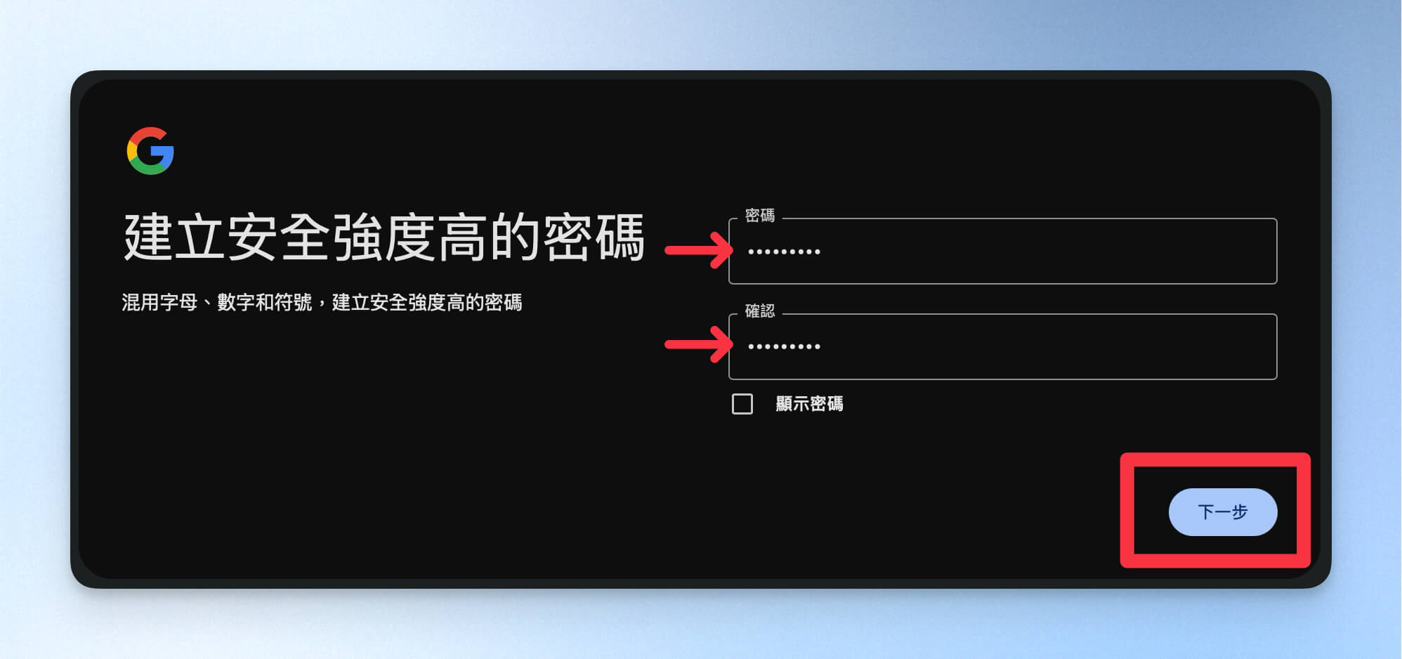 設定密碼(重複輸入兩次)後點擊「下一步」step 6