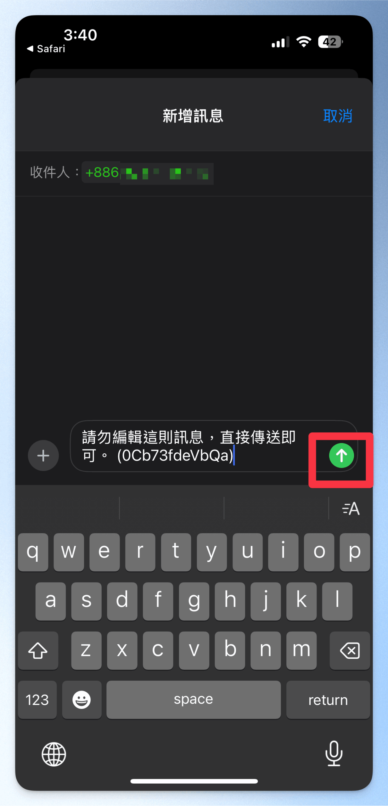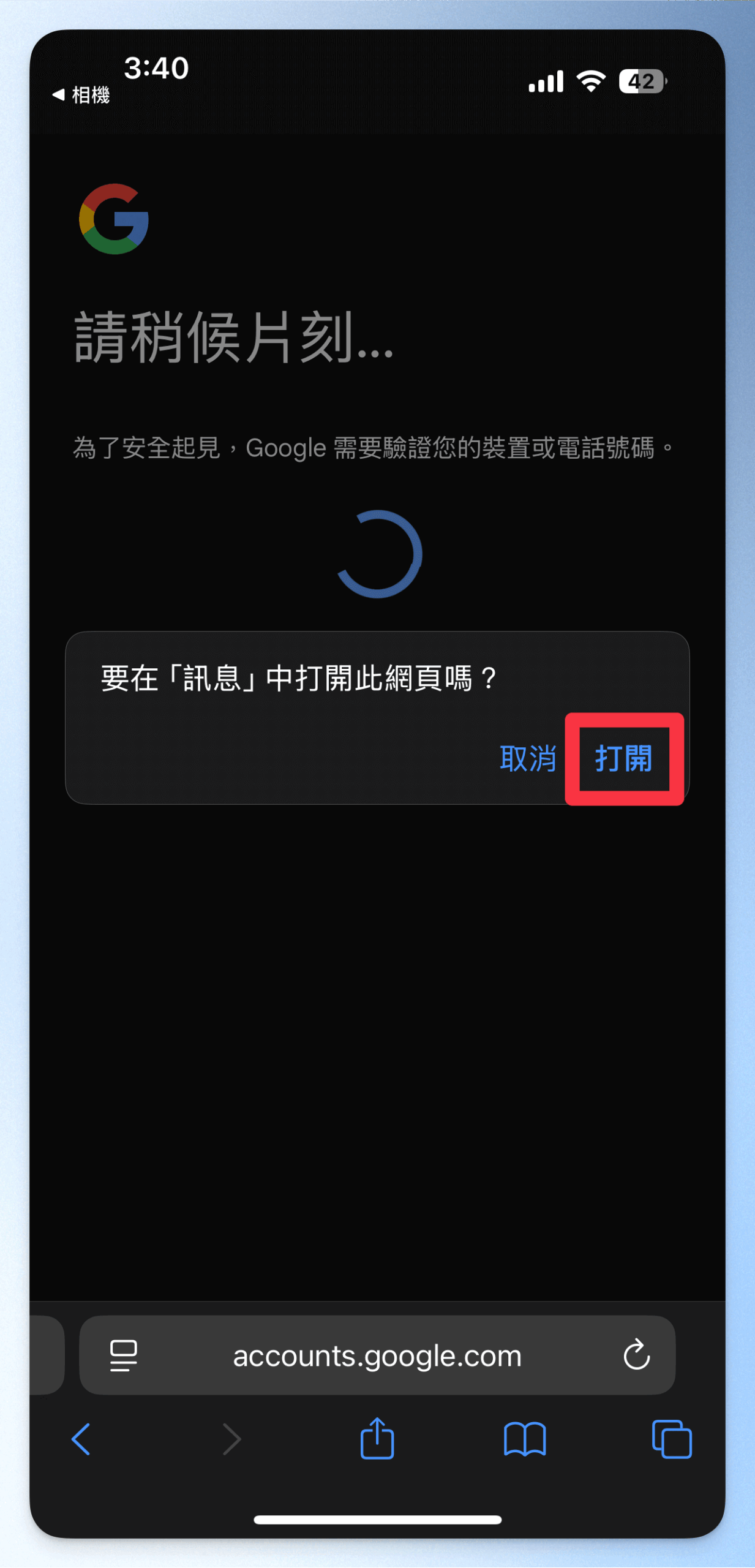 手機會以瀏覽器打開以下頁面,點擊「傳送簡訊」開始驗證電話號碼,如果系統問你要不要開啟訊息,點擊「打開」接著跳到手機簡訊區,你會發現已經有打好的文字,按照指示直接傳送這則訊息。如果你返回手機瀏覽器,它會請你回到你剛剛用來註冊帳號的裝置(電腦)。