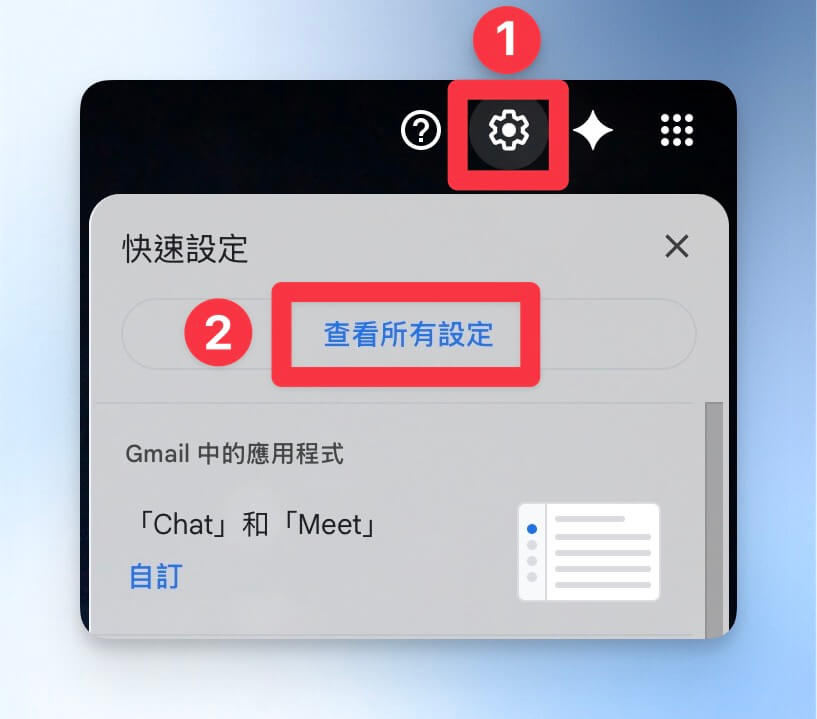 - 開啟電腦版 Gmail,點擊右上角「設定」