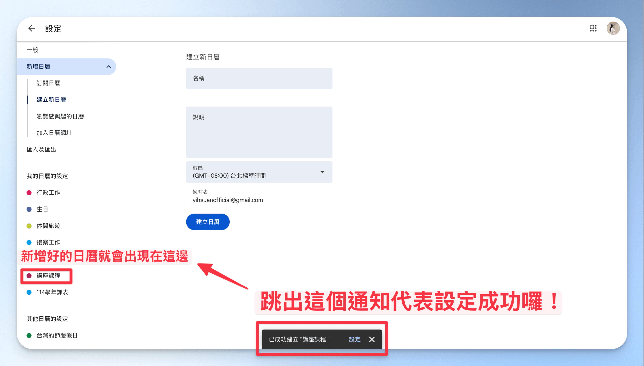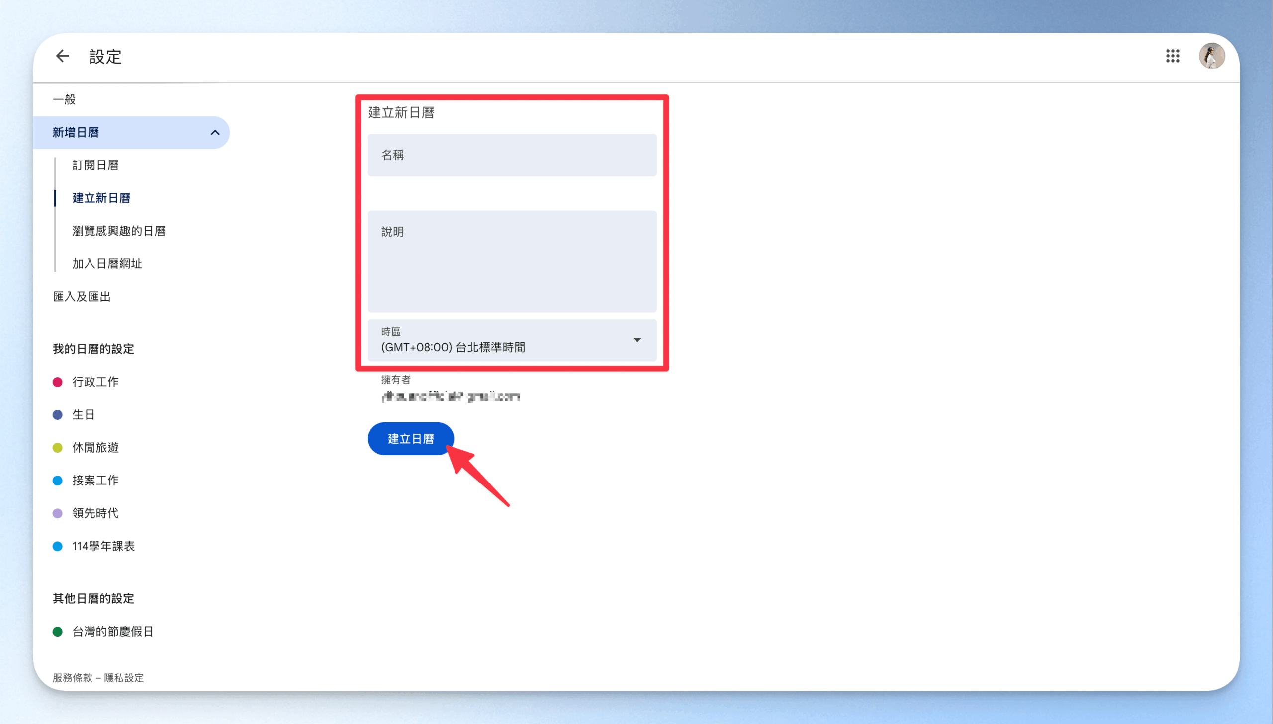 找到左方的新增日曆欄位,點擊「建立新日曆」