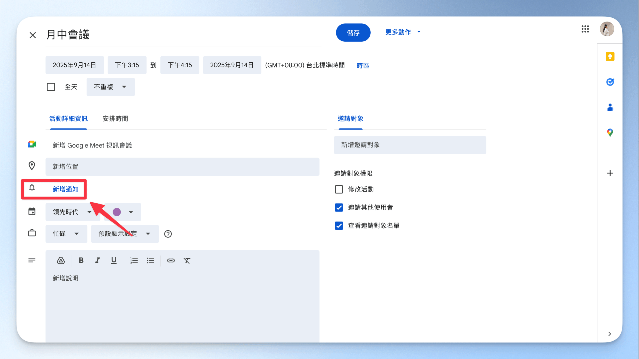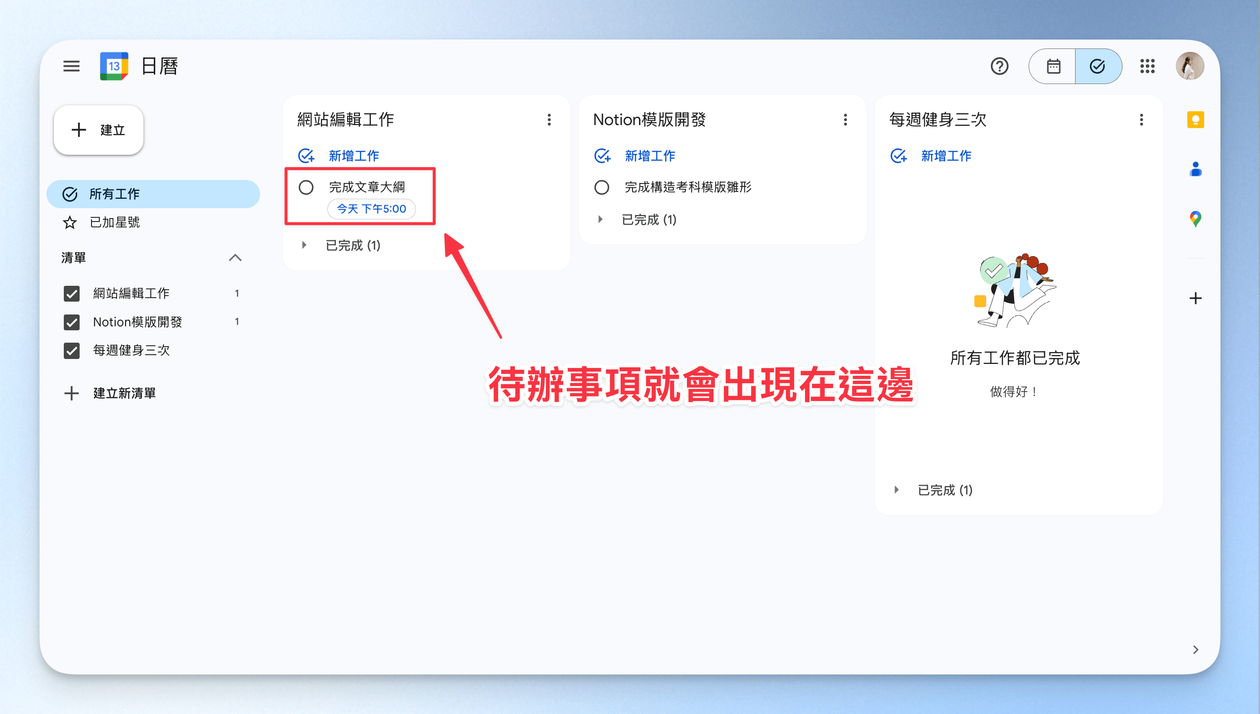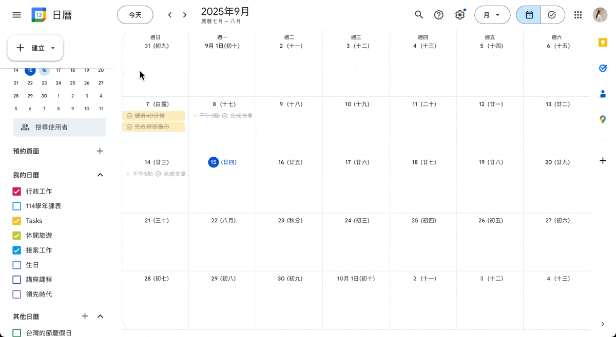 如果你是待辦事項跟行程都需要工具管理的人,直接在 Google 日曆介面上一起新增操作真的很方便。