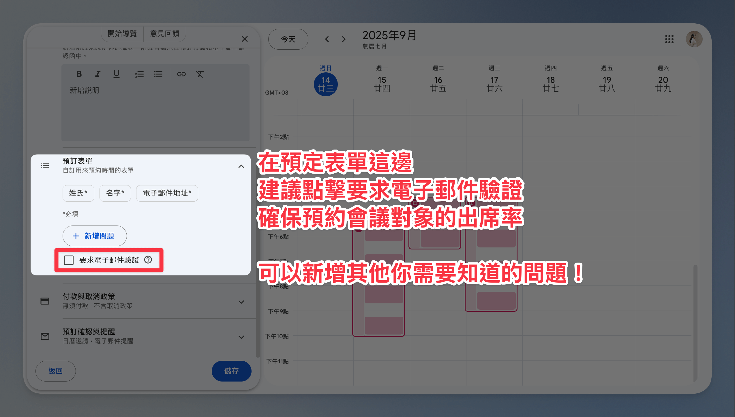 在預定表單這邊,也可以把電子郵件驗證打開、或者設定其他你需要知道的問題