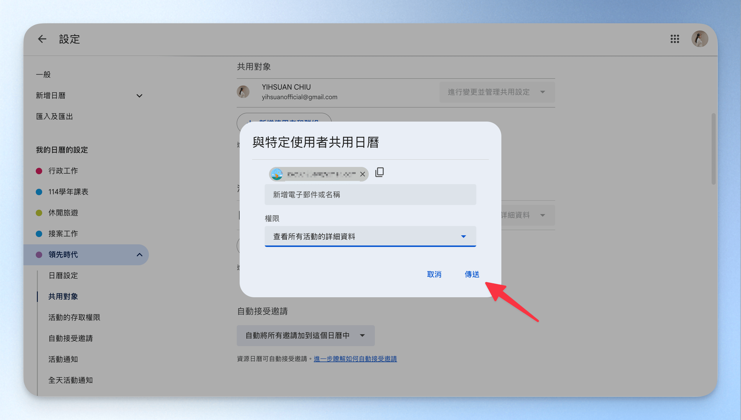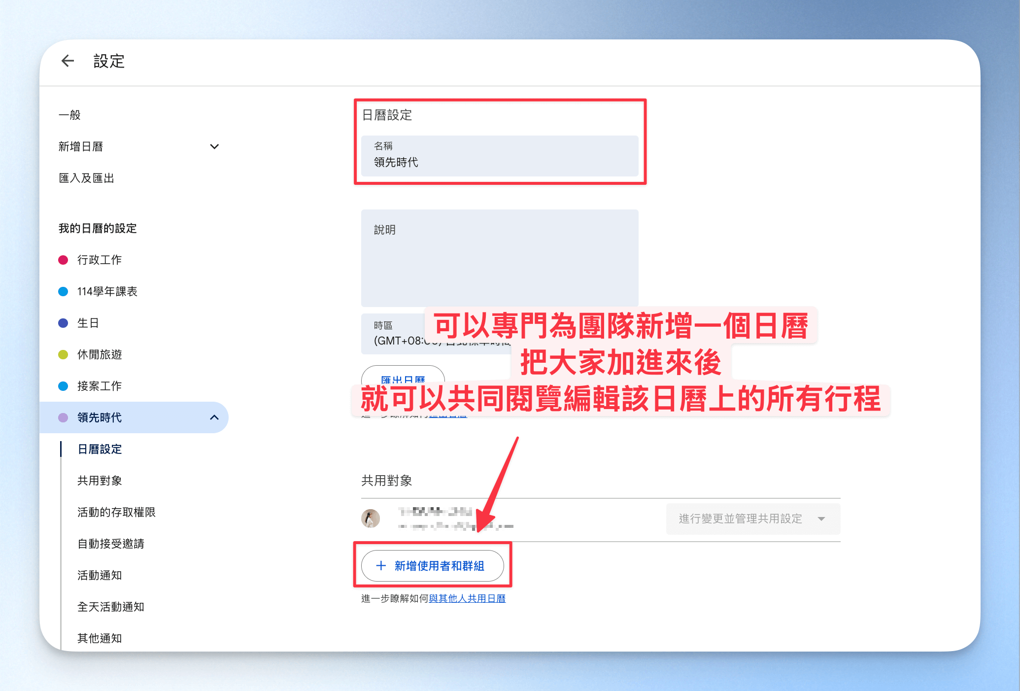 可以專門為團隊新增一個日曆,把大家的 Google 帳號加進來後,就可以共同閱覽或編輯該日曆上的所有行程囉!