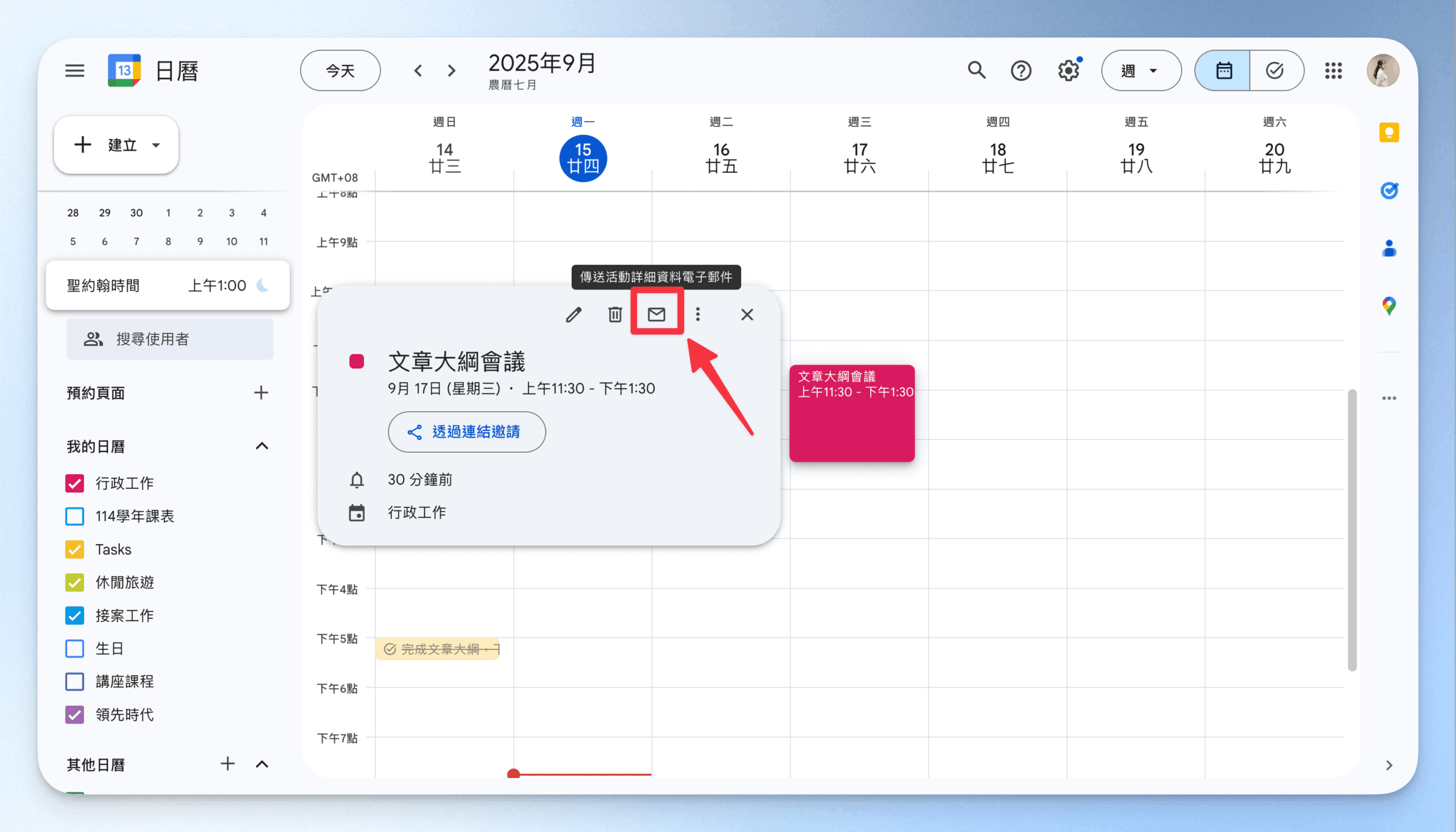 如果你有一些不是很緊急、但很重要的日程需要被提醒,可以參考下方教學,在日程開始前寄信提醒自己。