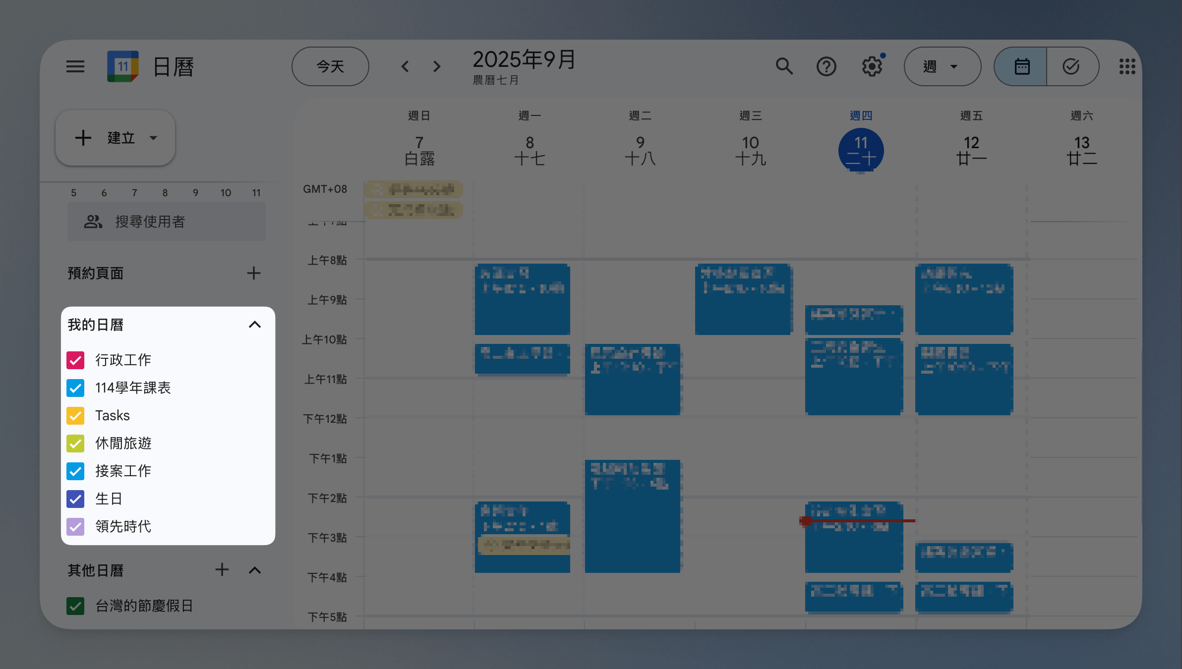 現在,我大多是 Notion 在管理日常工作的待辦,但行程管理的日曆工具,我仍舊是回到手機版跟電腦版的 Google 日曆上,幫自己的會議、課表跟聚會做排程管理,畢竟我自己使用 Google 日曆已經有十年以上了 XD 真的離不開啊~