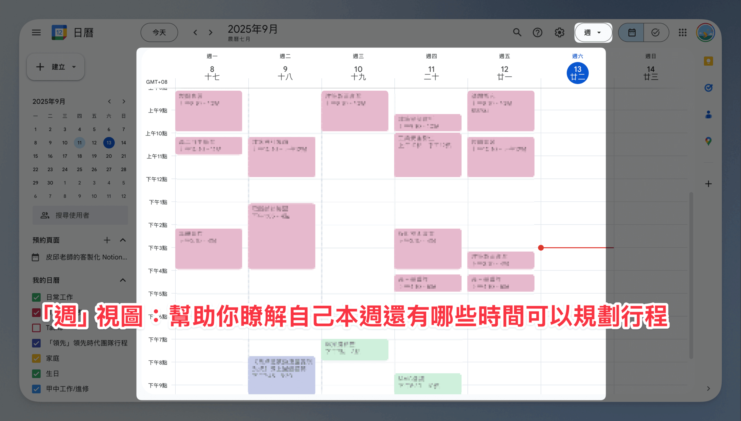 我很常直接在週檢視模式去看自己當週的行程,可以透過 Google 日曆快速知道自己當週已計畫的時間跟空閒的時間。