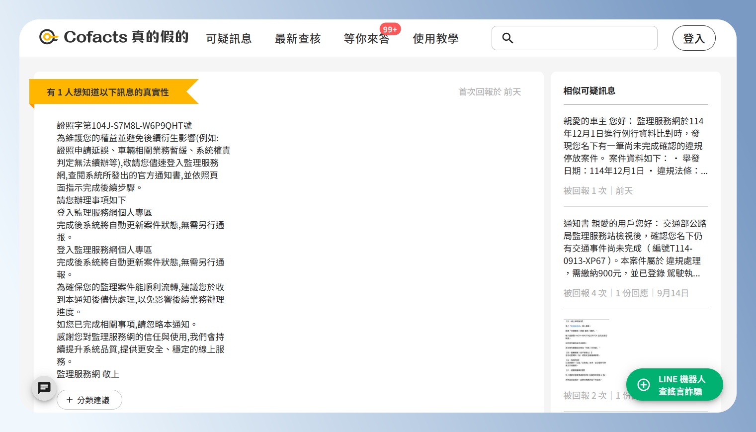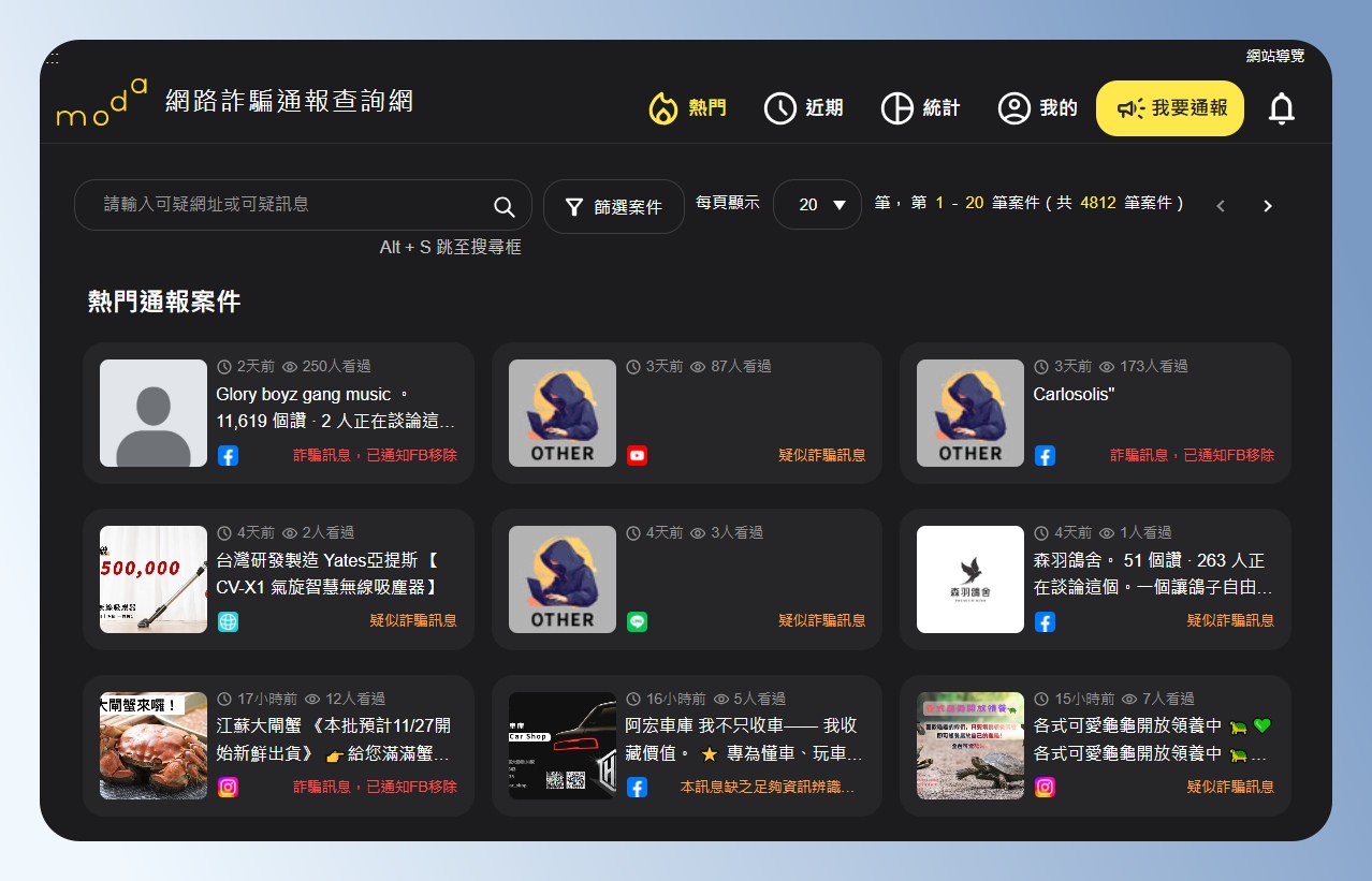 「網路詐騙通報查詢網」是一個專門彙整各類詐騙案例與警示的平台。你可以把可疑訊息、網站名稱或簡訊內容輸入查詢,看看是否有人通報過相同手法,特別適合用來比對「有沒有其他人也被騙過類似訊息」。