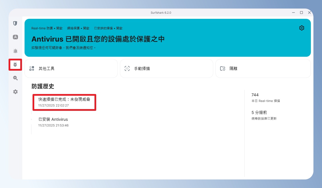 Surfshark Antivirus 的即時防護與掃描功能可以確保你的電腦安全,避免你在不知情的情況下下載到惡意檔案、木馬程式或勒索軟體。對於經常下載檔案、處理 Email 附件的人來說,這個功能非常重要,能有效減少裝置被惡意程式控制的風險。