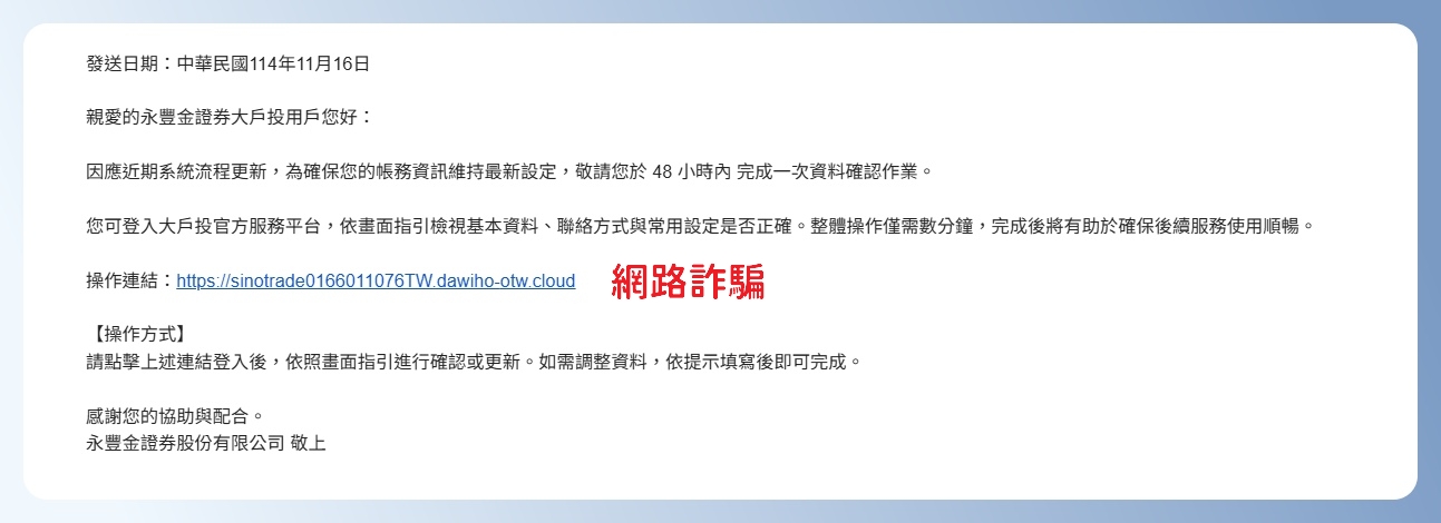 這類詐騙會偽裝成銀行、信用卡中心或金融機構寄來的正式 Email,內容通常會寫得非常逼真,例如「信用卡遭盜刷請立即確認」等,並附上一個看起來很像官方的連結。