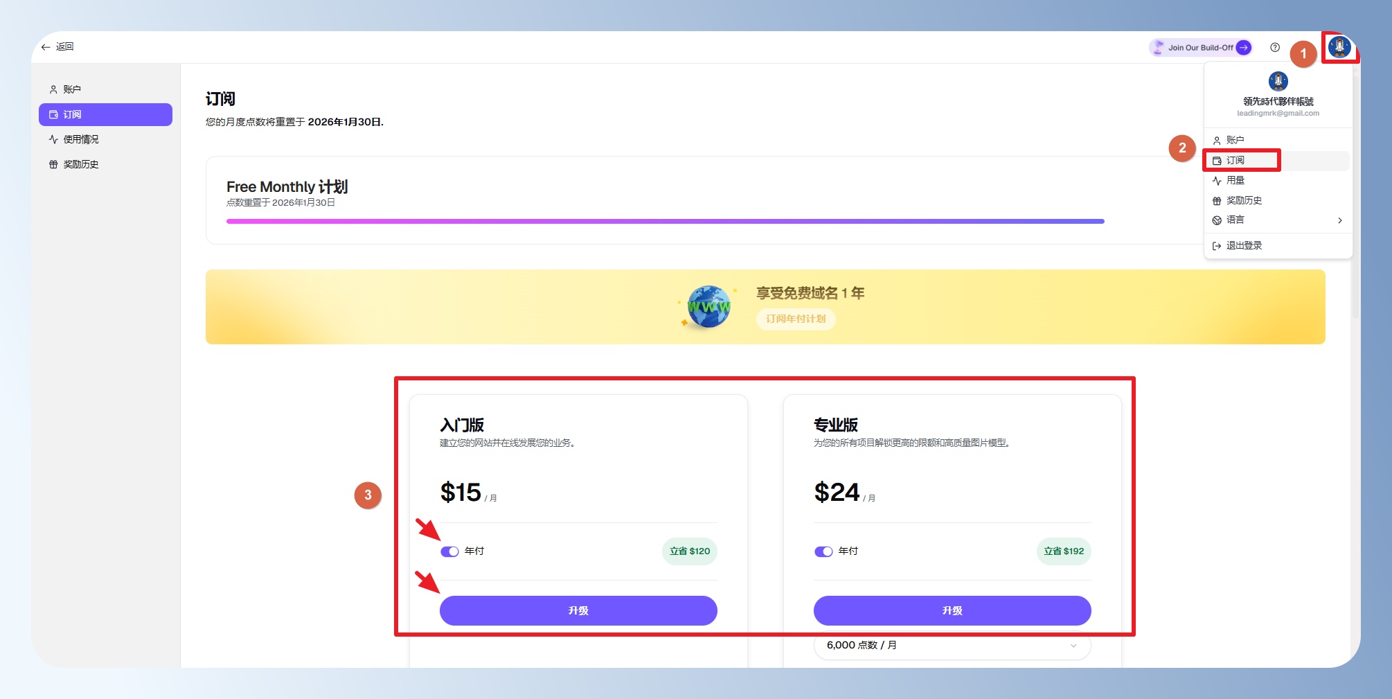 Readdy AI 根據使用量與功能,分成三種方案,詳細的比較表我整理在下方~建議可以先從免費方案體驗操作流程,再依實際架站需求選擇是否升級。