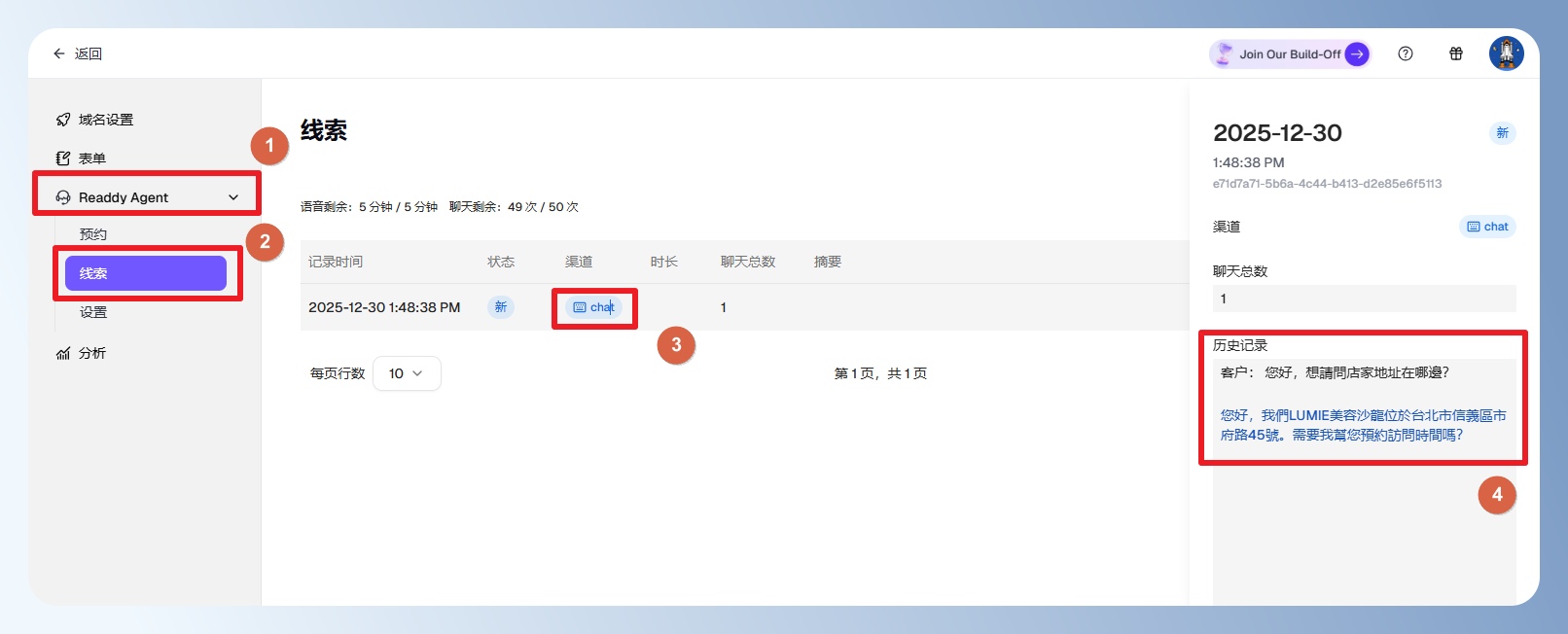 在「Readdy Agent > 線索」頁面可查看訪客的問題與 AI 客服的回覆紀錄。