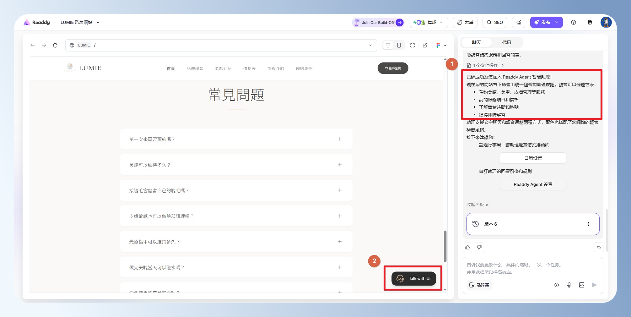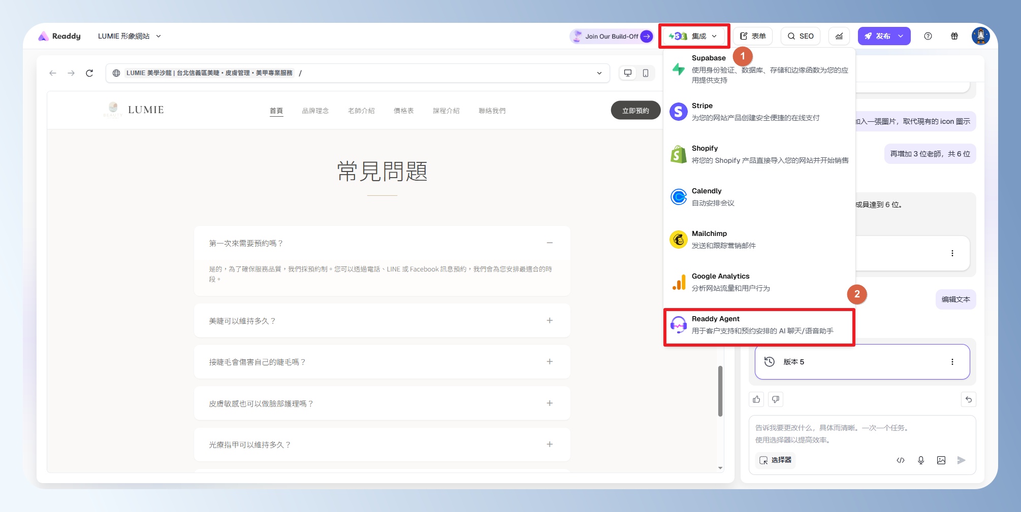 Readdy AI 可以串接第三方服務,如果你想在網站中加入 AI 客服的功能,可以點擊右上方的「集成」,再點擊「Readdy Agent」。