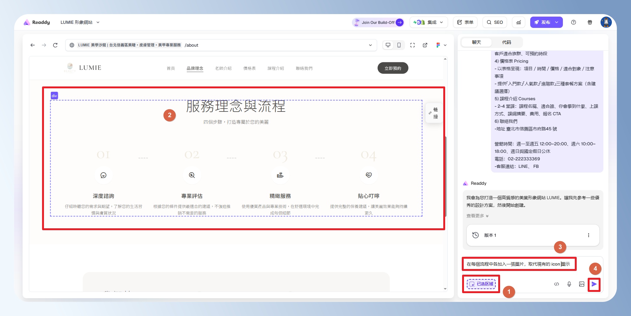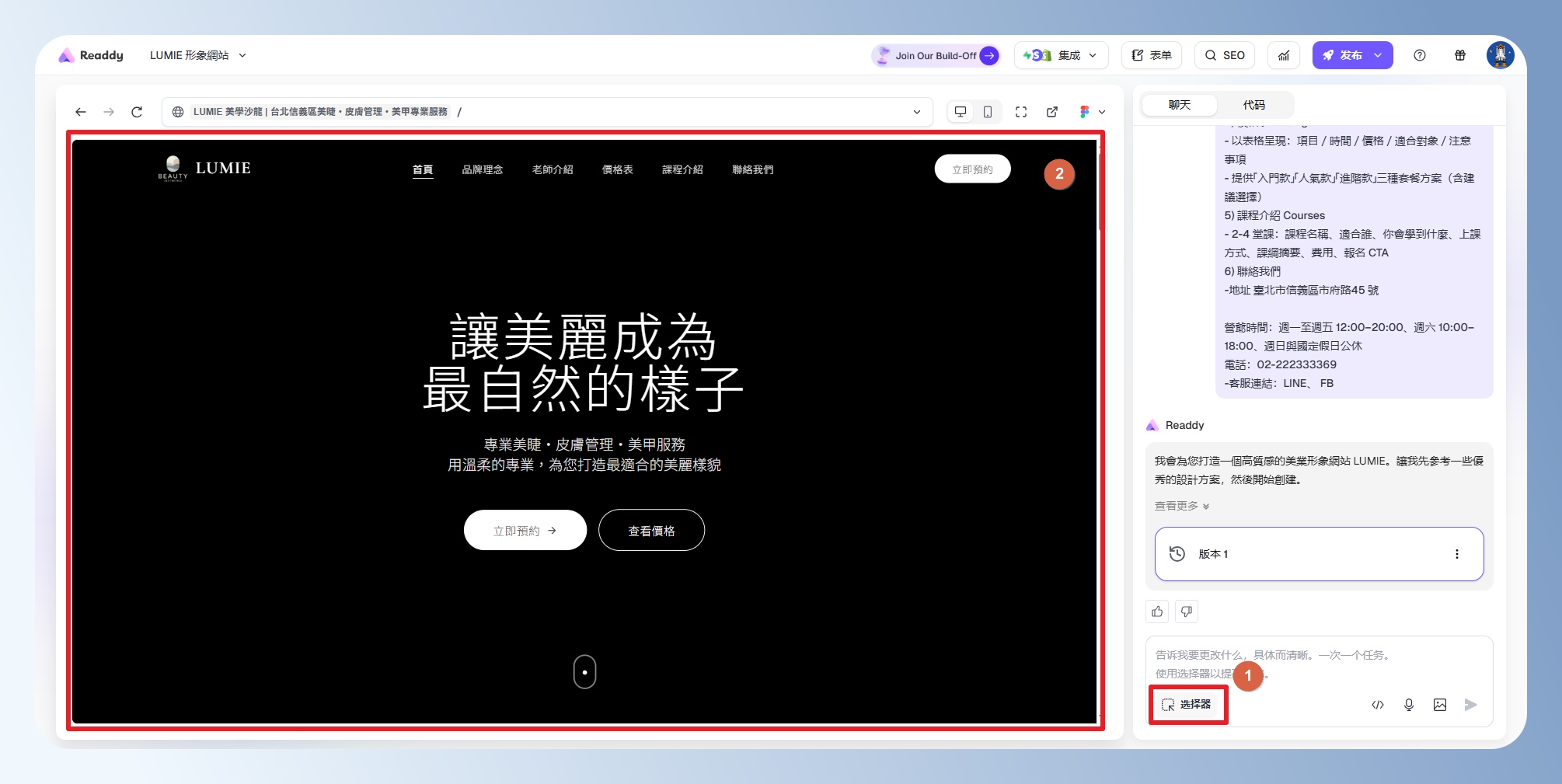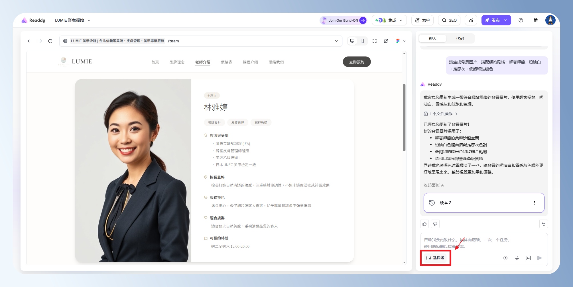Readdy AI 幫我們生成的圖片或文字,都是可以做替換的,如果今天想要修改圖片,一樣是使用對話框的「選擇器」來點選想修改的區塊。