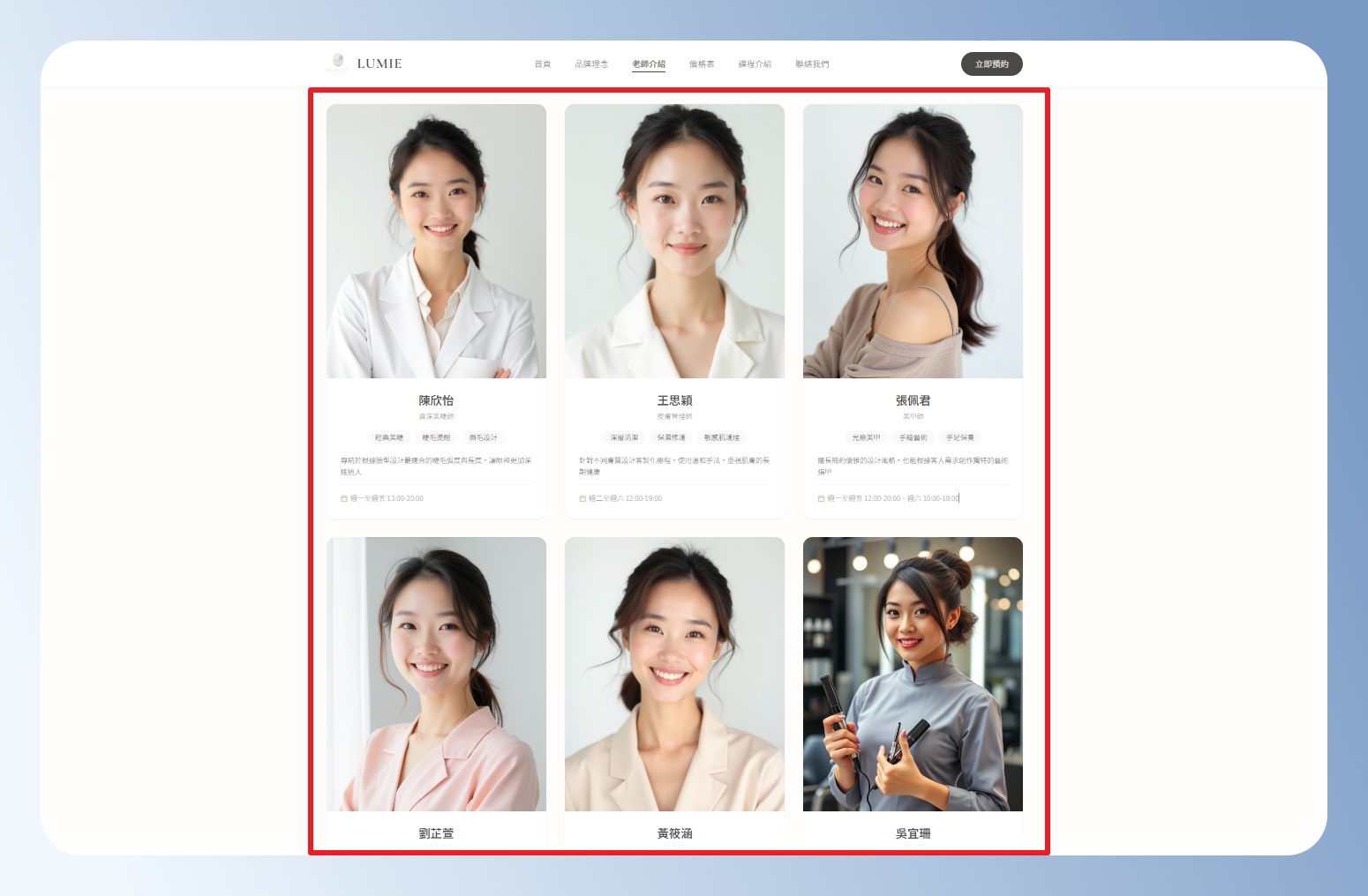 查看生成畫面,6 位老師的版面已完成!只要稍微調整一下圖片與文字內容就可以完成更新了!過程中完全不需要麻煩工程師。