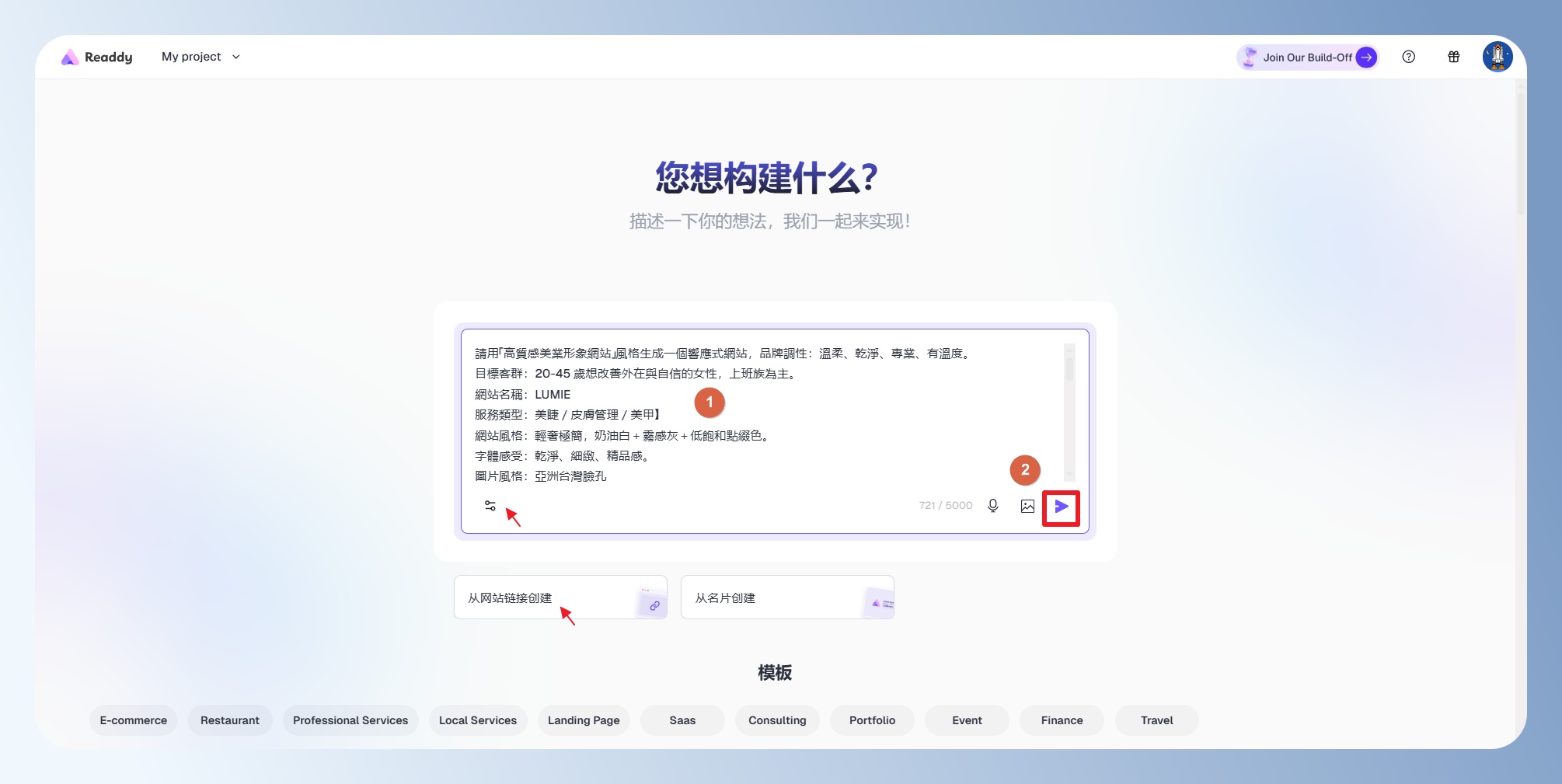 Readdy AI 的特色就是整個建站流程是從文字描述開始,只需要說明品牌定位,以及網站的主要用途,AI 就會根據這些資訊,自動生成一個具備基本架構的網站頁面。對於不熟悉網站製作流程的人來說,進入門檻相對低,也比較不容易在一開始就感到負擔。