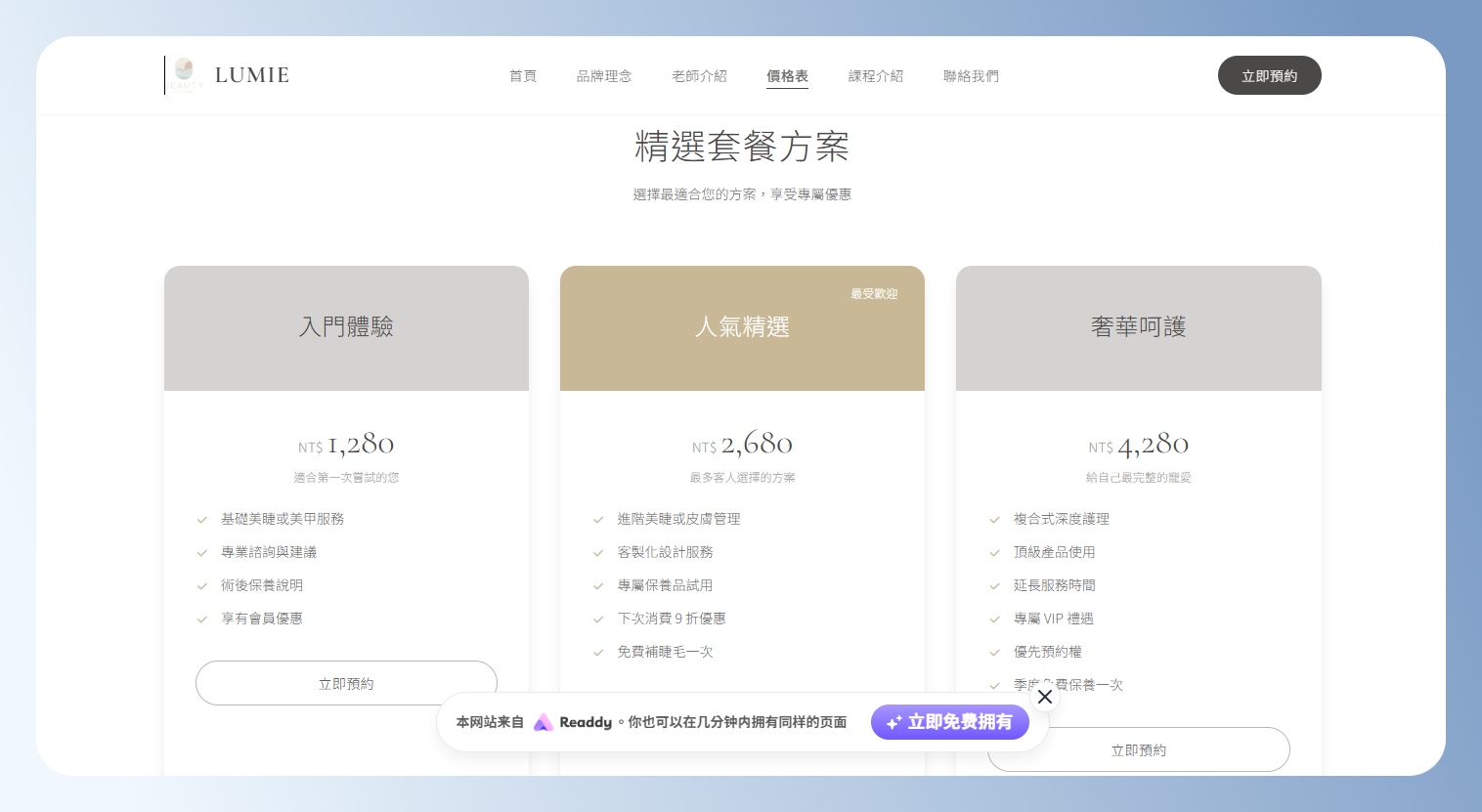 美甲師、美睫師或皮膚管理工作室,多半已經透過 Instagram 經營作品與客源,如果想要有更正式的品牌形象,可以考慮使用 Readdy AI,建立一個專業網站,讓客人一眼看懂服務項目與預約方式。