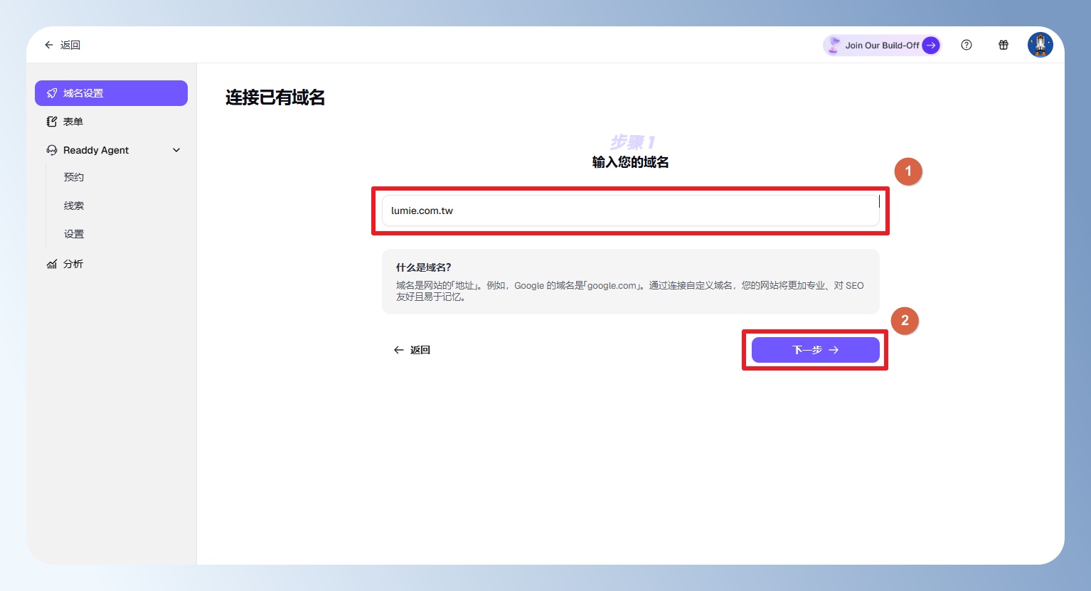 不過這邊的網址是 Readdy AI 的網域,如果你想要將網站綁定到自己專屬的網域,可以點選「發佈到自訂域名」。
