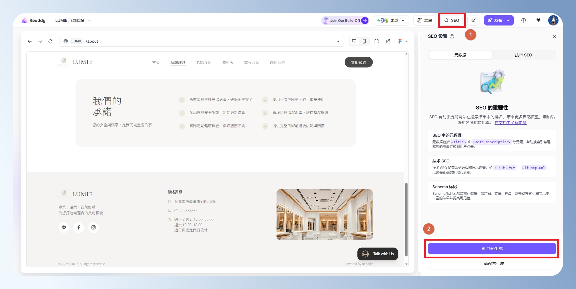 點選右上角的「SEO」按鈕,接著點擊下方的「AI 自動生成」。