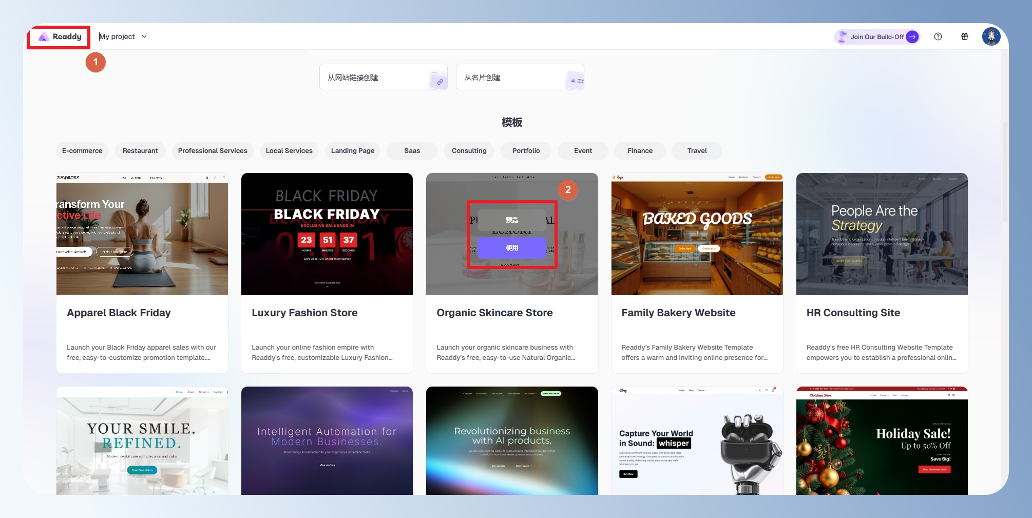 Readdy AI 有提供豐富的內建模板,可點擊左上角的 Readdy AI Logo,回到生成畫面,網頁下方是模板區,可進行預覽或直接使用。